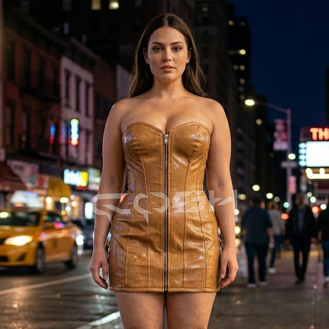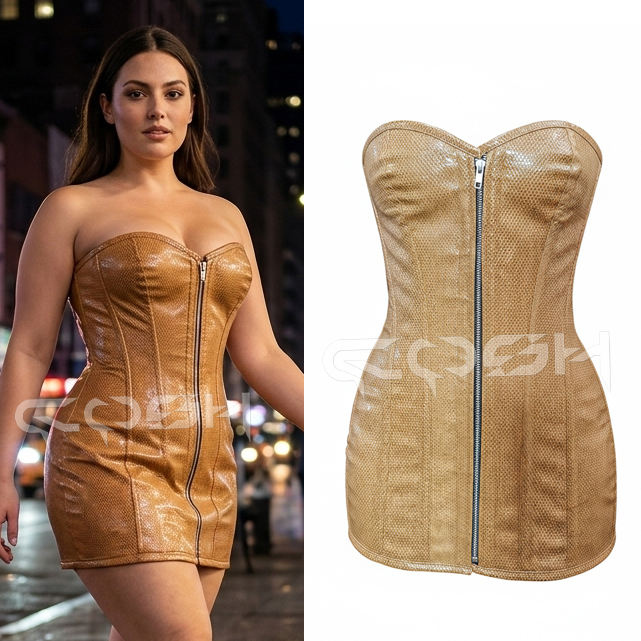 ขายส่งชุดมินิเดรสคอร์เซ็ท PVC สีทองมีซิปด้านหน้าไม่มีสายหนังบอดี้คอนปาร์ตี้แวร์คลับแวร์ชุดแฟชั่นสตรี
