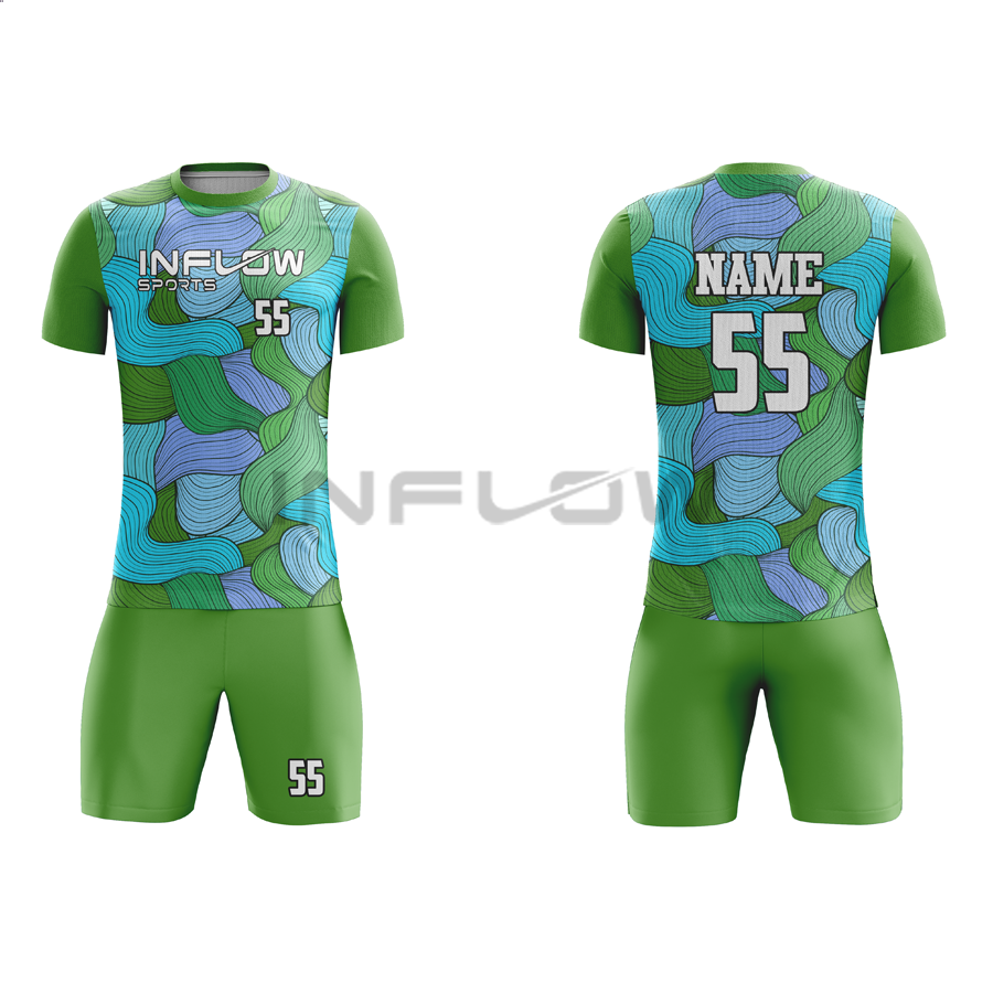 ชุดยูนิฟอร์มฟุตบอลลายคลื่นไล่เฉดสีขายส่ง บริการ OEM สำหรับฤดูหนาว ฤดูร้อน ฤดูใบไม้ร่วง พร้อมตัวเลือกชื่อ