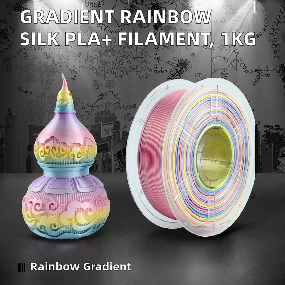 เส้นใยพิมพ์ 3 มิติ PLA Plus สีรุ้งไล่เฉดแบบขายส่ง ขนาด 1.75 มม. น้ำหนัก 1 กก. ความบริสุทธิ์สูง ใช้งานร่วมกับเครื่องพิมพ์ 3 มิติแบบ FDM ได้หลากหลาย