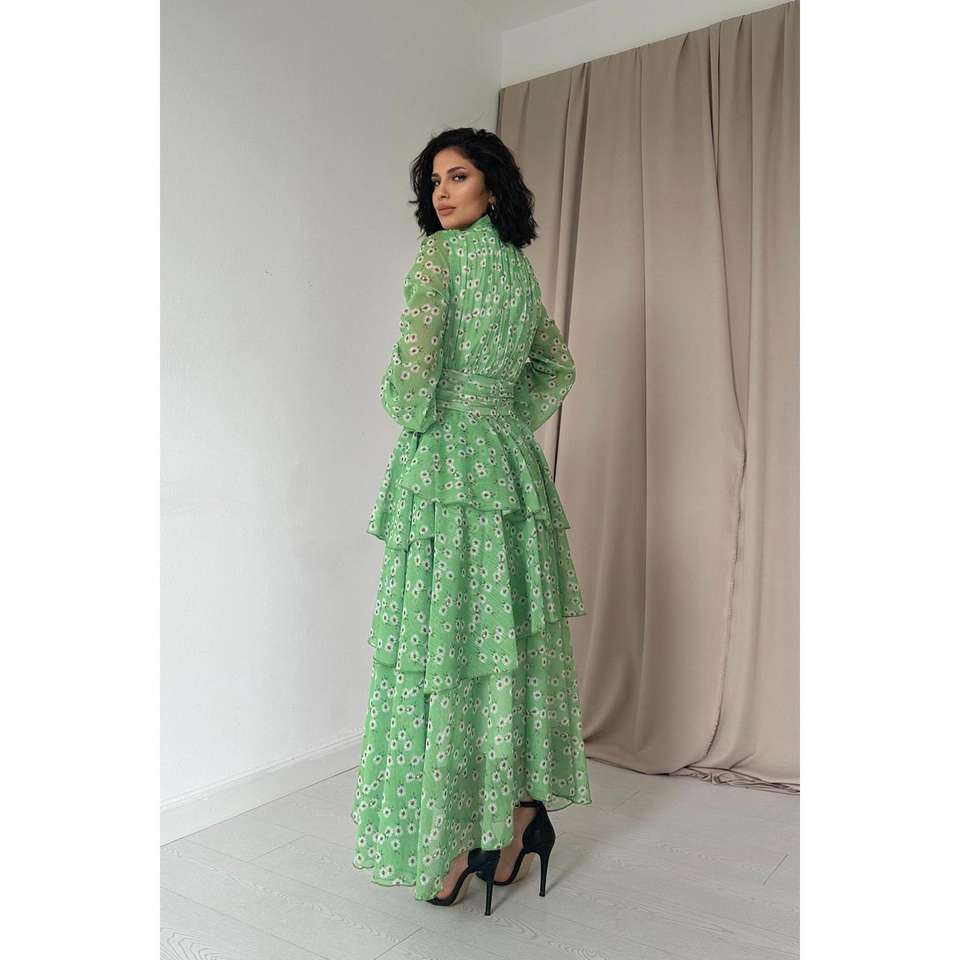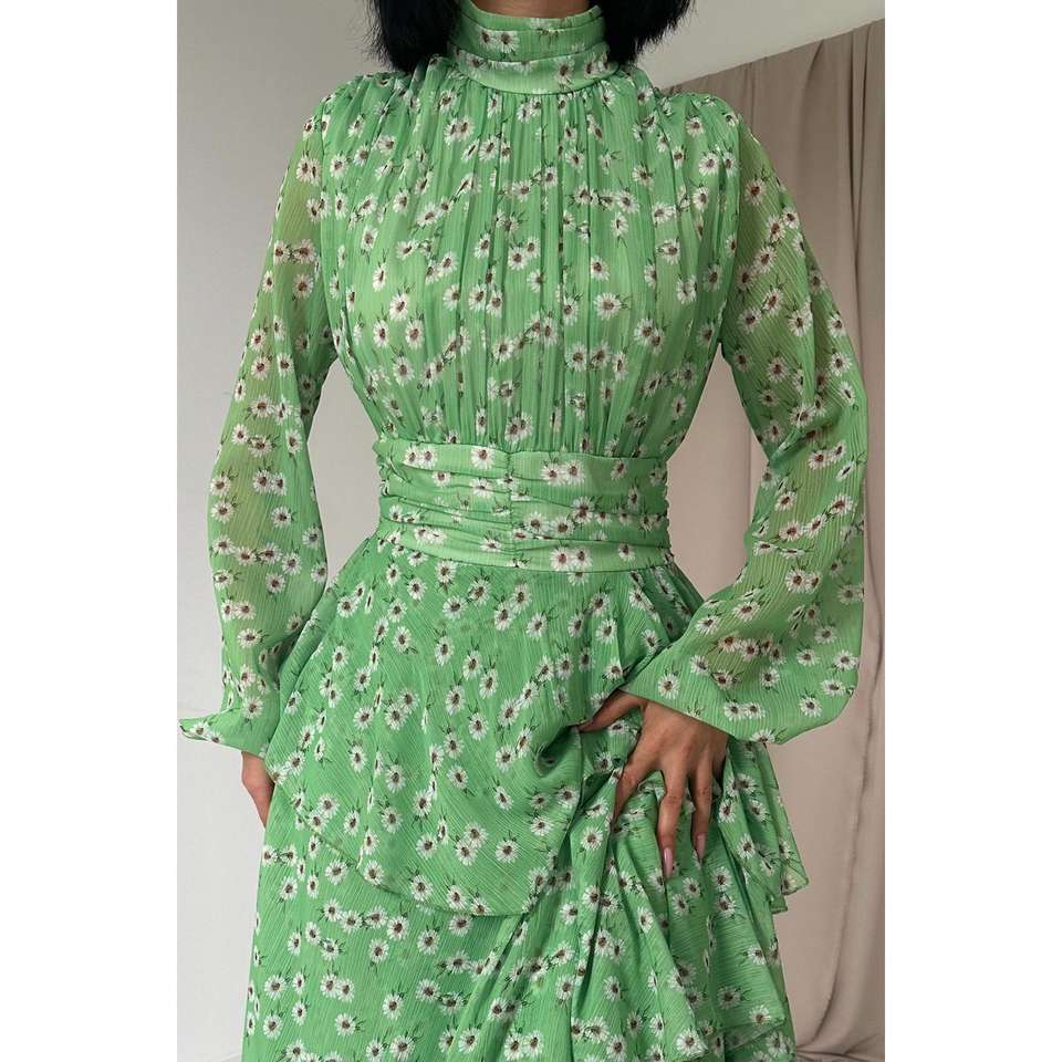 เดรสชีฟองสีเขียวทรงเอไลน์ขายส่ง พร้อมดีเทลเอวธรรมชาติและลายพิมพ์ดอกไม้