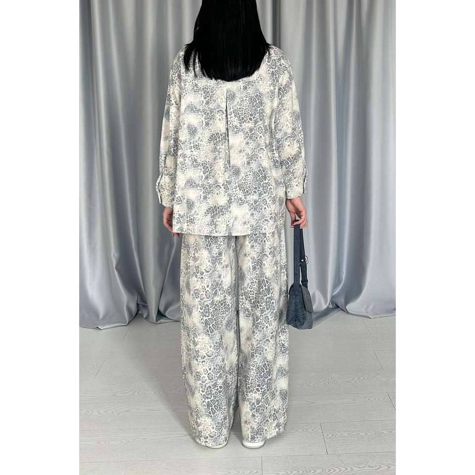 ชุดผ้าลินินลายเสือดาวสีเทาสำหรับผู้หญิงแบบ 2 ชิ้น เสื้อแจ็คเก็ตมีฮู้ดและกางเกงขายส่ง เพื่อความมีสไตล์และความสบาย