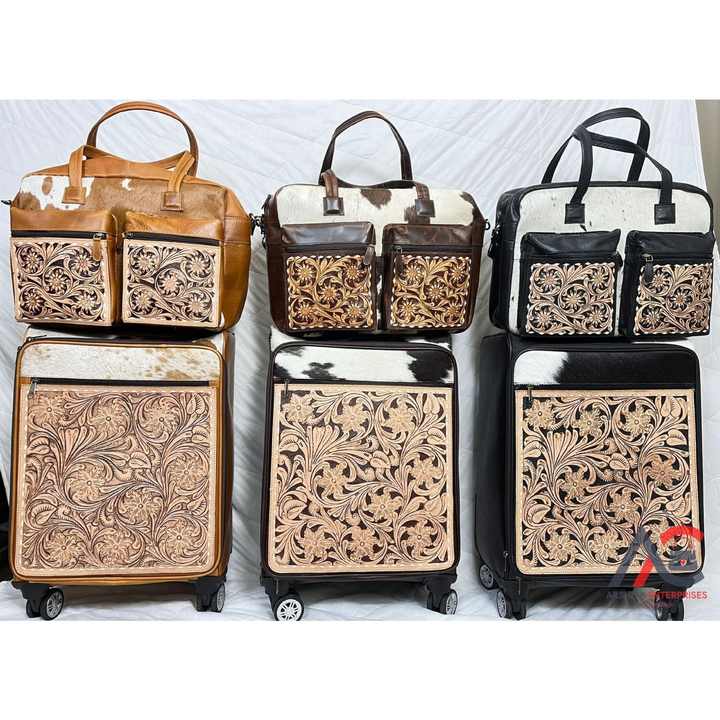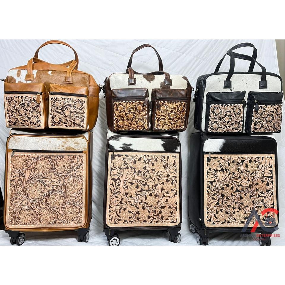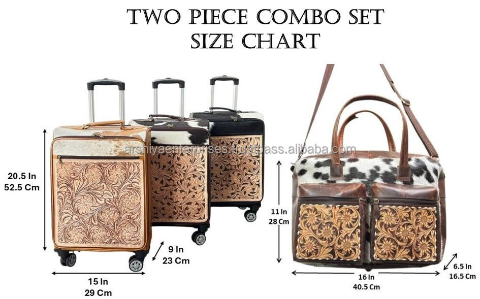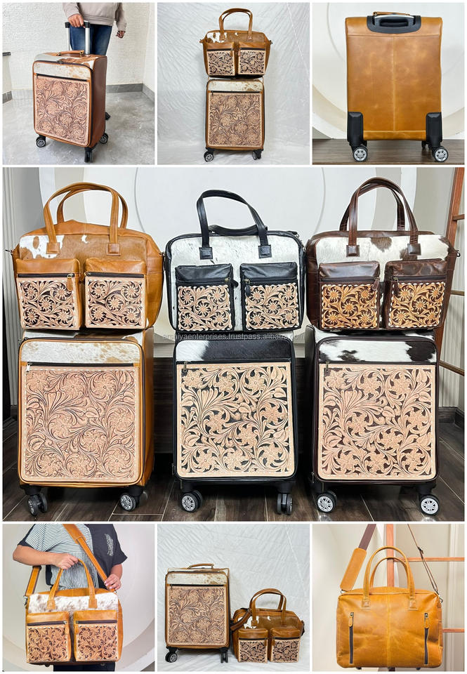ชุดกระเป๋าเดินทางหนังแท้ทำมือแบบสองชิ้นสำหรับผู้หญิง พร้อมกระเป๋าถือเข้าชุด สไตล์ตะวันตก