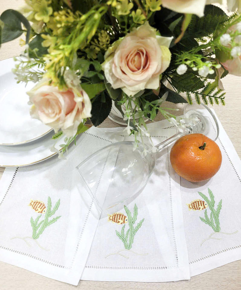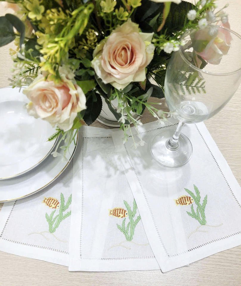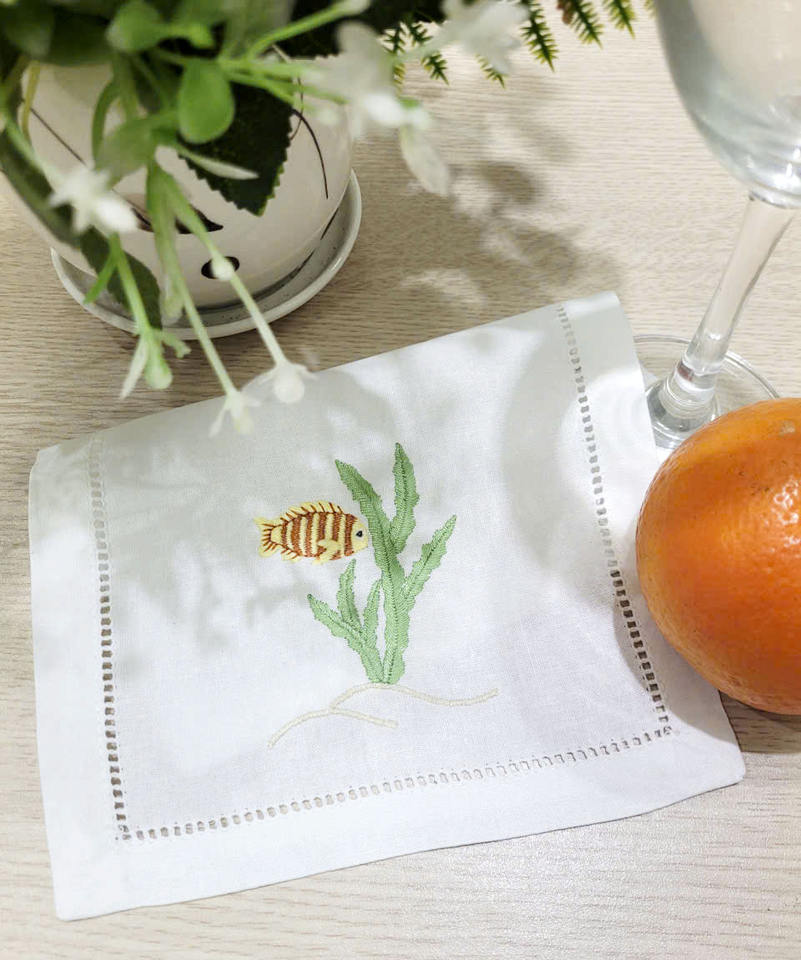 ผ้าเช็ดปากปักลายปลาแบบทำมือขายส่ง ผ้าฝ้ายสีขาวเย็บริมผ้าแบบเฮมสติทช์ ผ้าเช็ดปากแบบพับสำหรับค็อกเทล ใช้สำหรับบ้าน งานอีเว้นท์ และบาร์