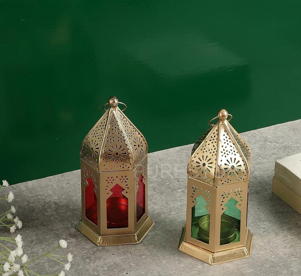 ชุดโคมไฟ2ชิ้นบนโต๊ะขนาดเล็กทำจากทองแดงของอินเดียทำด้วยมือเชิงเทียนโลหะดีไซน์แบบชาวโมร็อกโก