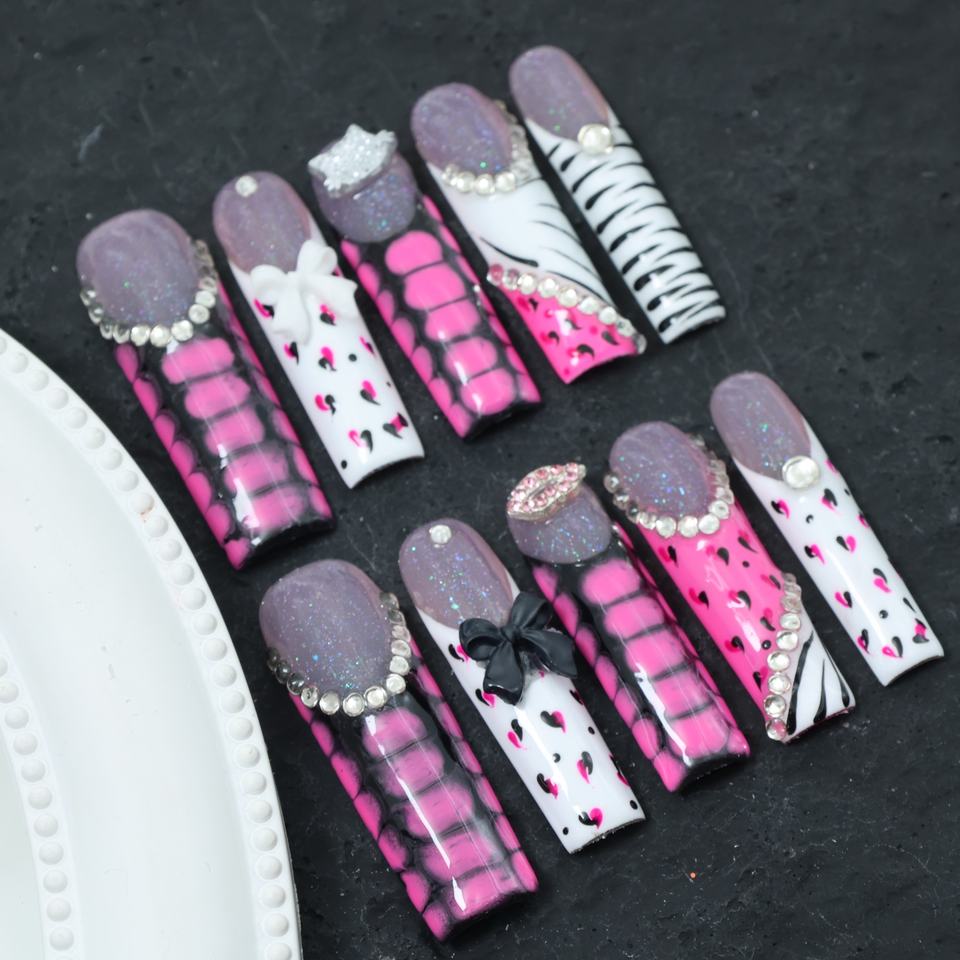 เล็บปลอมอะคริลิกทำมือสุดหรู ขายส่ง รูปทรงสี่เหลี่ยมและทรงโลงศพ ยาว ปลายเล็บแบบฝรั่งเศส 3 มิติเต็มแผ่น ลายผีเสื้อ/ดาว