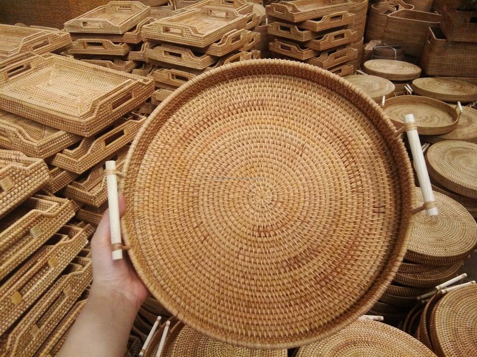 ถาดหวายทรงกลมทำด้วยมือถาดหวายแนววินเทจถาดหวายธรรมชาติปรับได้ถาดชาเบเกอรี่ผลไม้จากเวียดนาม