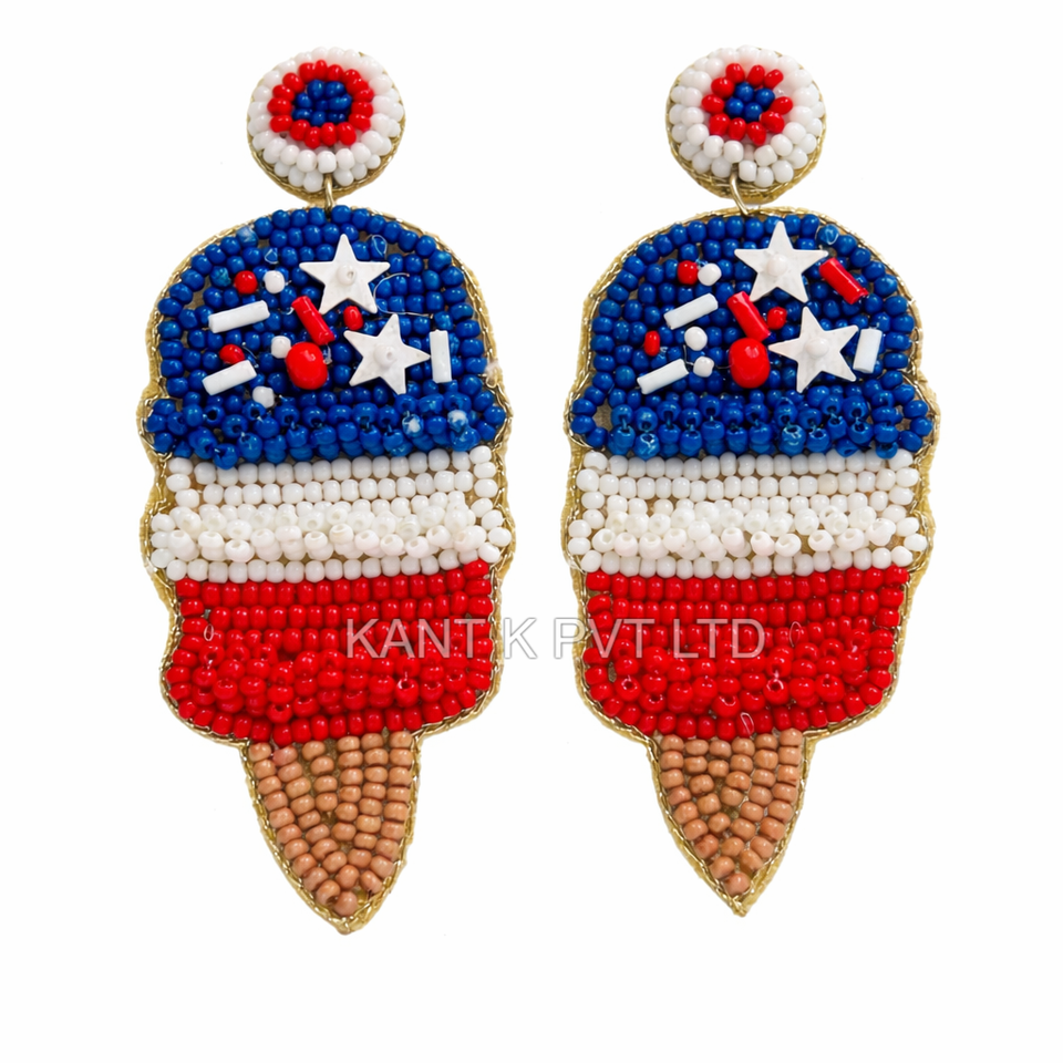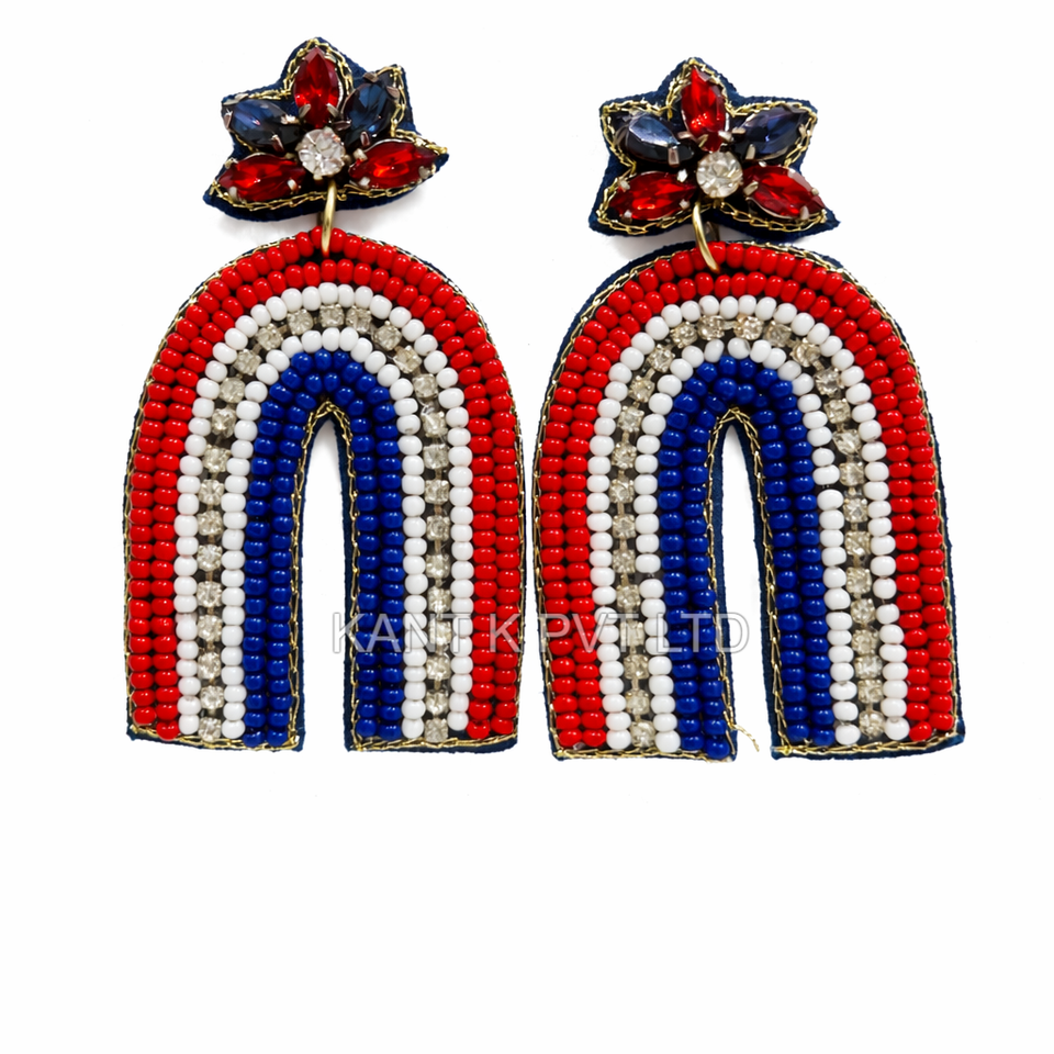 ต่างหูรูปตัวยูประดับลูกปัดลายธงชาติอเมริกา ทำมือ ขายส่ง สีแดง ขาว น้ำเงิน เครื่องประดับแสดงความรักชาติ