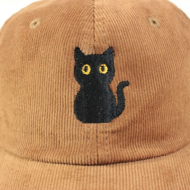 หมวกขายส่ง หมวกแก๊ปคอร์ดูรอย 6 แผง สีดำ หมวกคอร์ดูรอยพรีเมียมปักลายแมว หมวกเบสบอลปักลายแมว หมวกปักลายวินเทจ