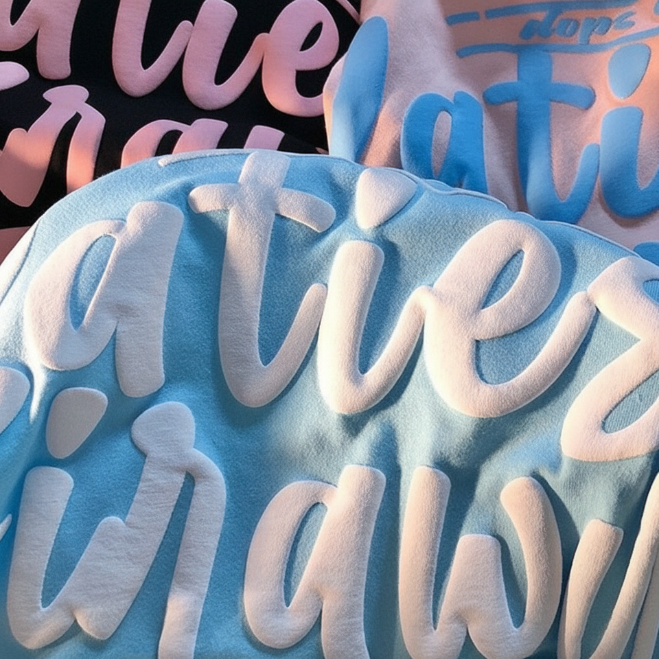 เสื้อยืดพิมพ์โลโก้สำหรับผู้ชายเสื้อยืดพิมพ์ลายพัฟโฟม3D ขนาดใหญ่ออกแบบได้ตามต้องการ
