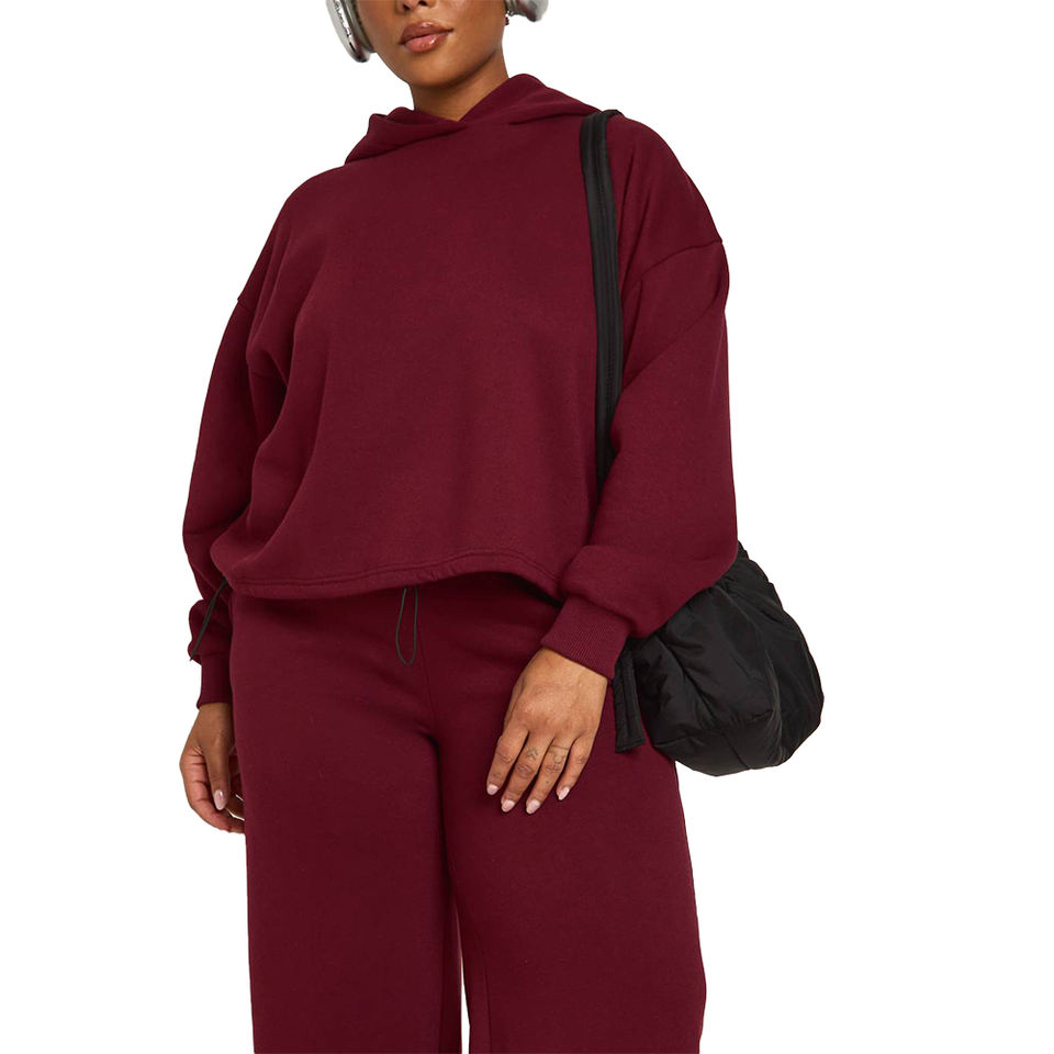 เสื้อครอปฮู้ดดี้ผ้าเฟรนช์เทอร์รี่เนื้อหนาสีแดงเบอร์กันดีสำหรับผู้หญิง สไตล์สตรีทแวร์สั่งทำพิเศษ พร้อมโลโก้ด้านหน้า เหมาะสำหรับฤดูหนาว