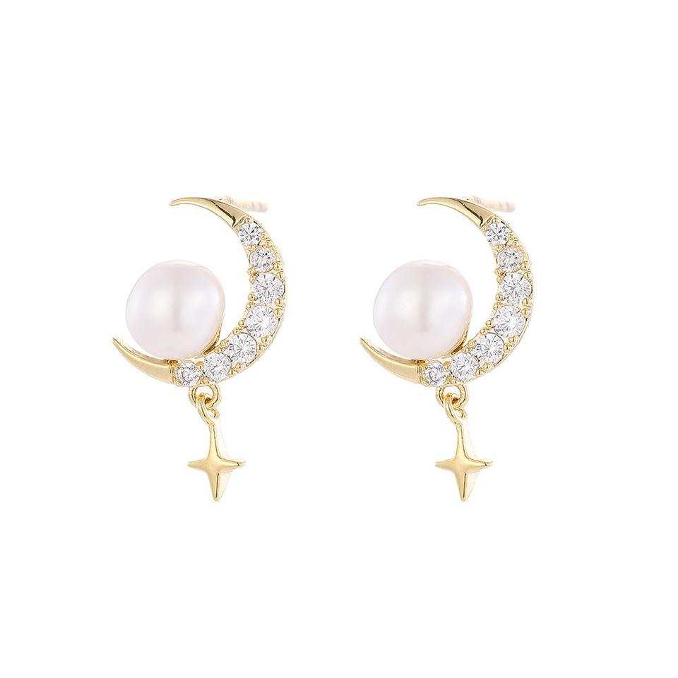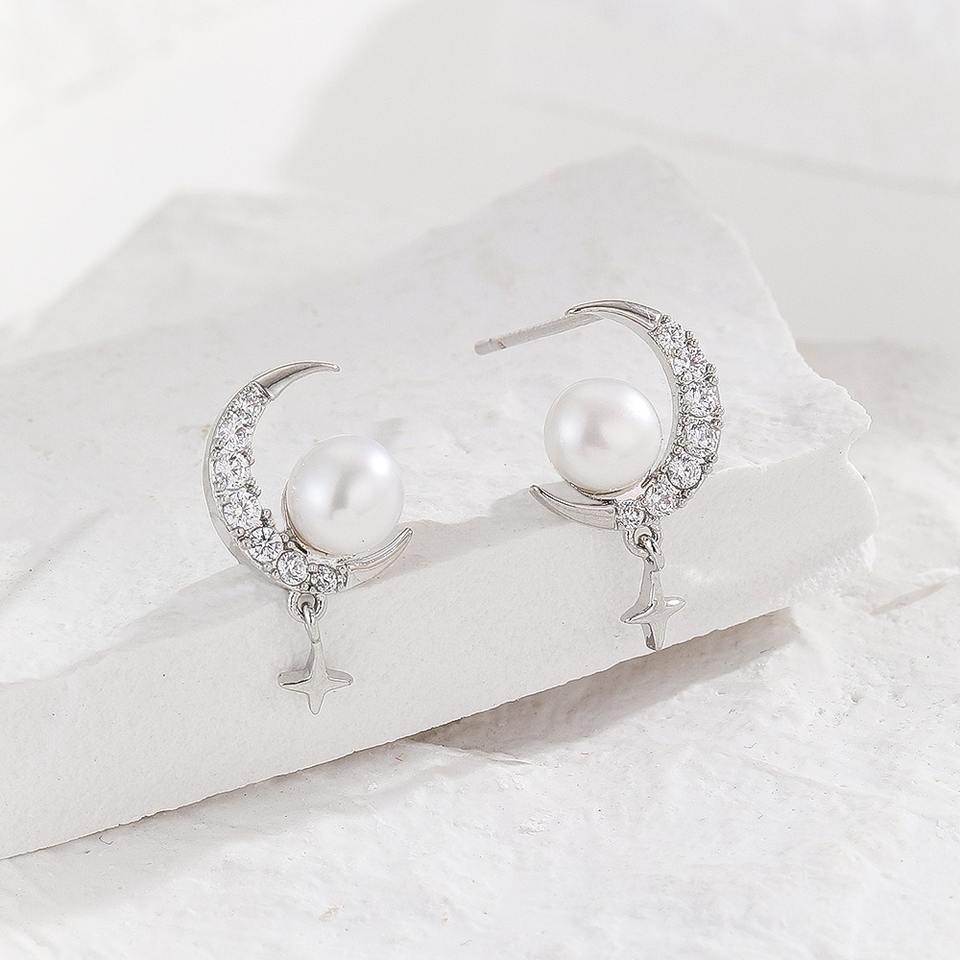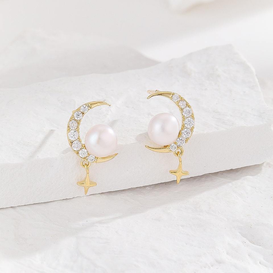 ต่างหูแฟชั่นผู้หญิงระดับไฮเอนด์ขายส่ง ประดับเพชรซิร์คอน มุกน้ำจืด รูปทรงพระจันทร์ สไตล์เกาหลี ญี่ปุ่น ทำจากทองแดง เหมาะสำหรับวันครบรอบ