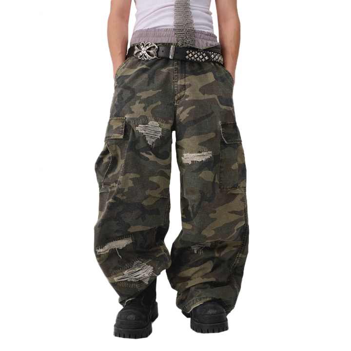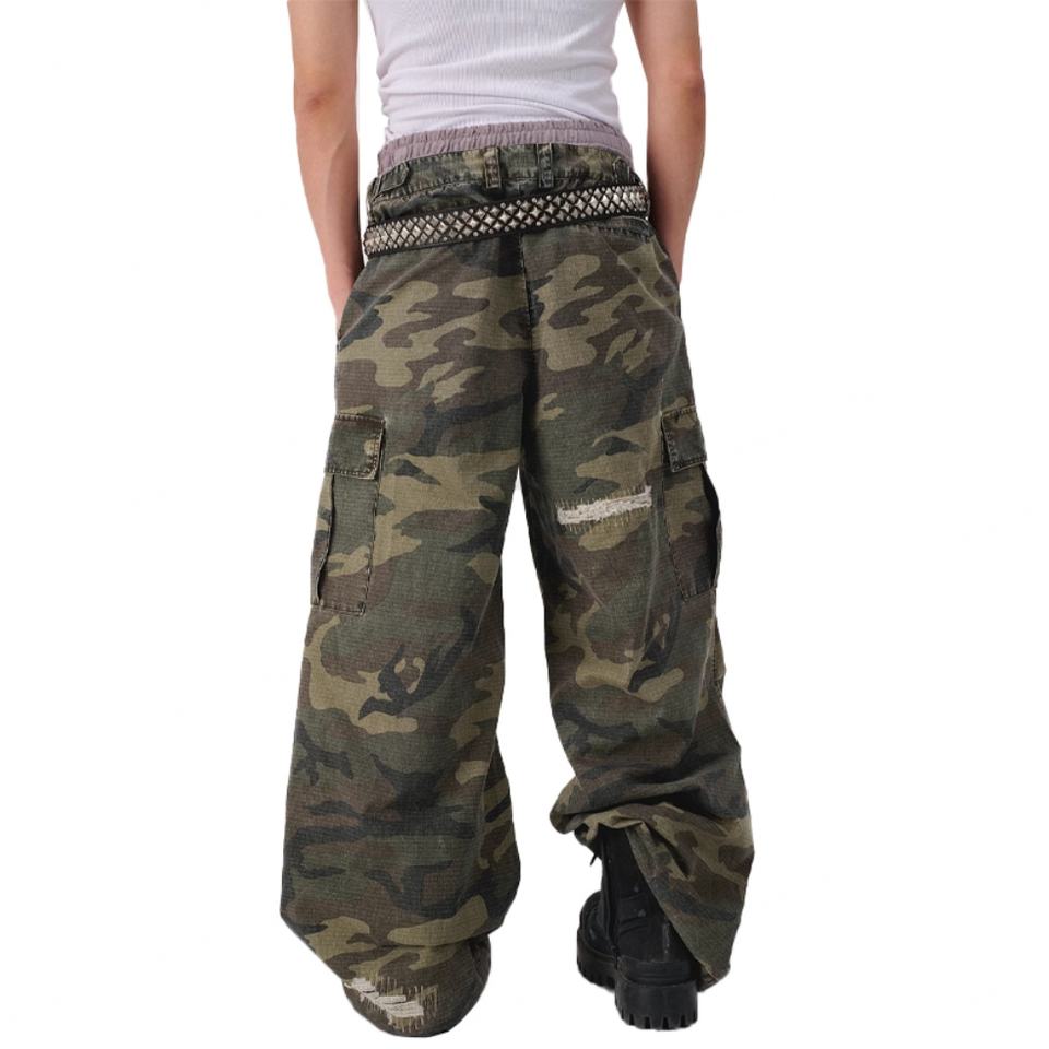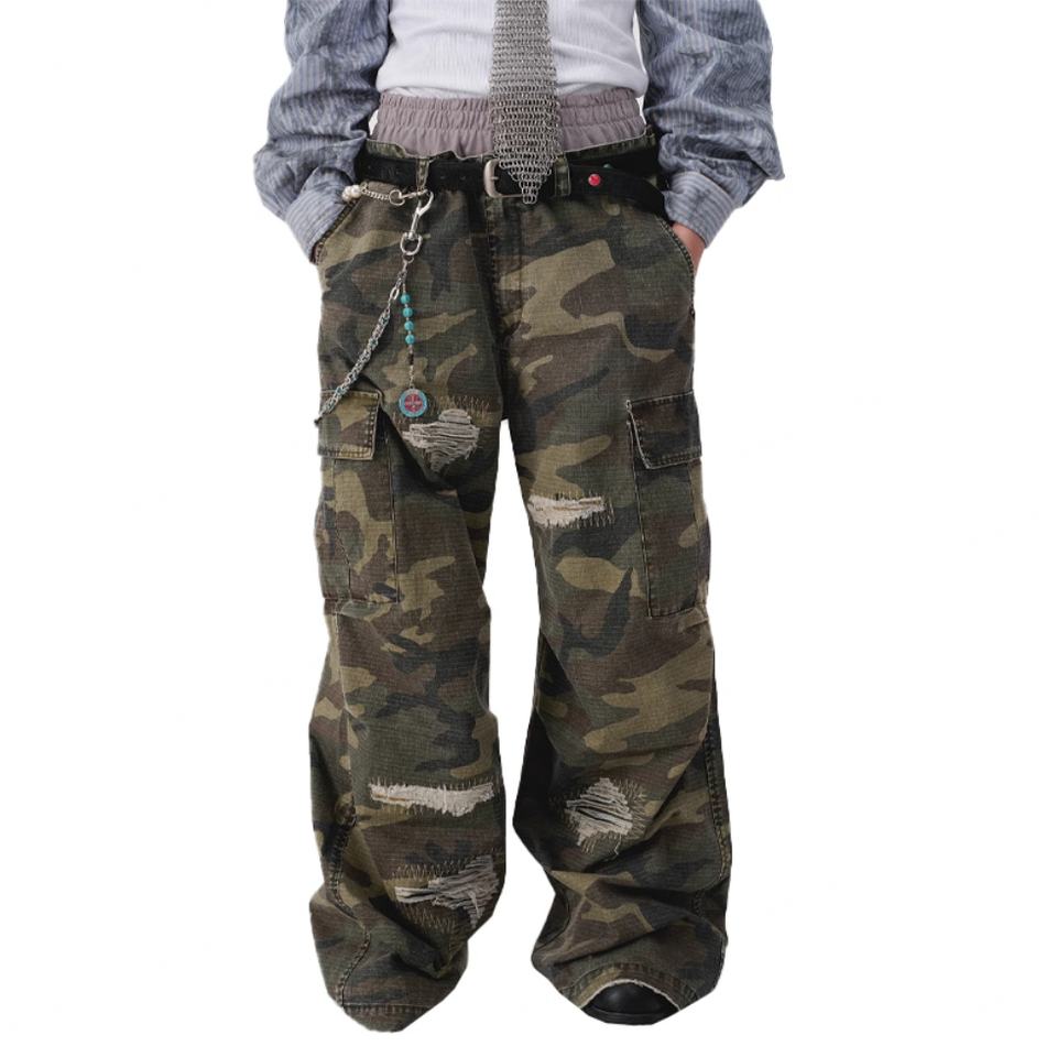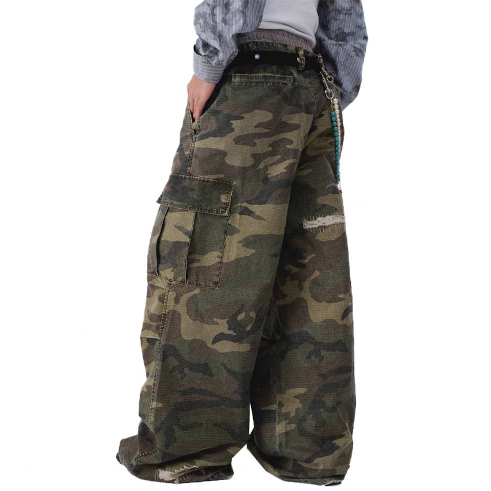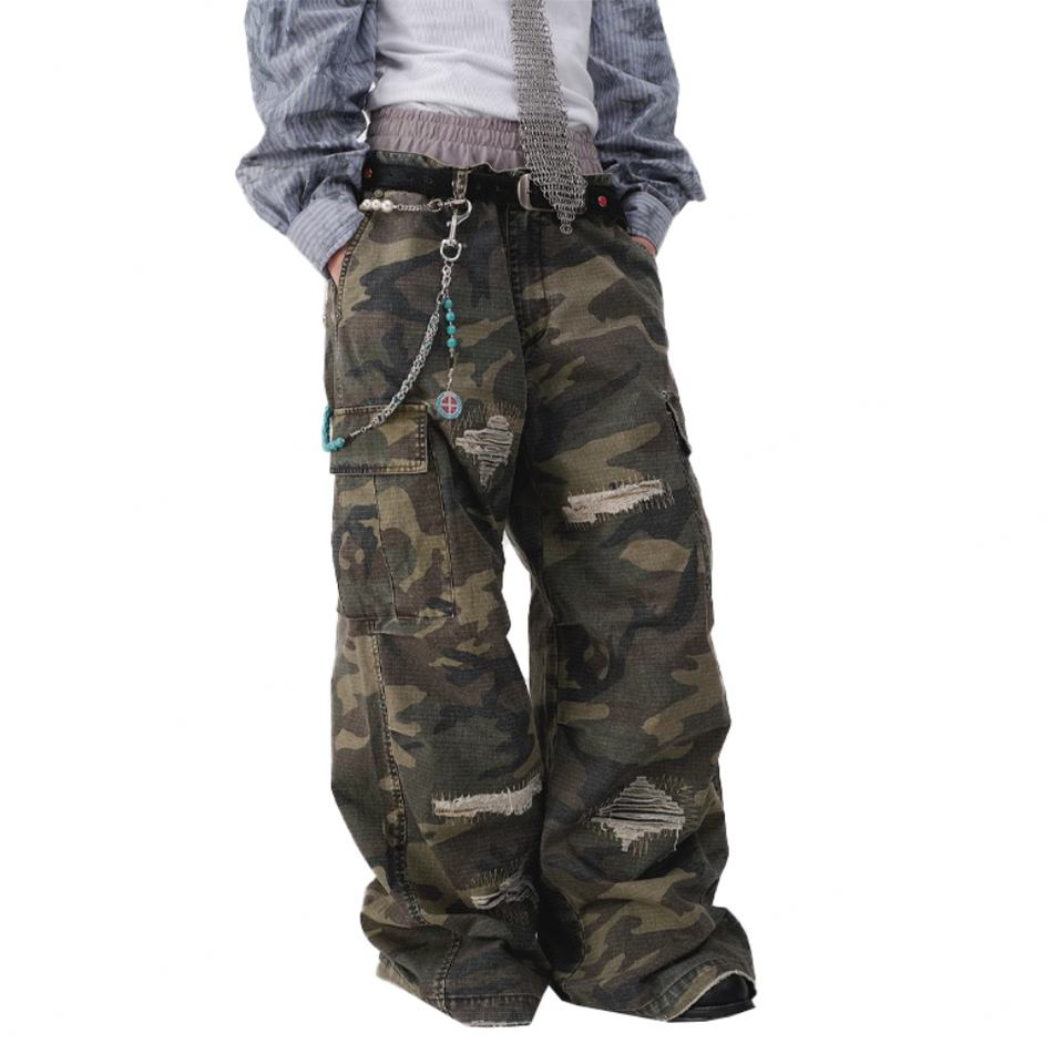 กางเกงคาร์โก้เอวสองชั้นลำลองปักลายพรางแบบวินเทจผ้าฝ้าย 100% คุณภาพสูงขายส่ง ซักทำสีซีดแบบดิสเทรส ปักลายตามสั่ง