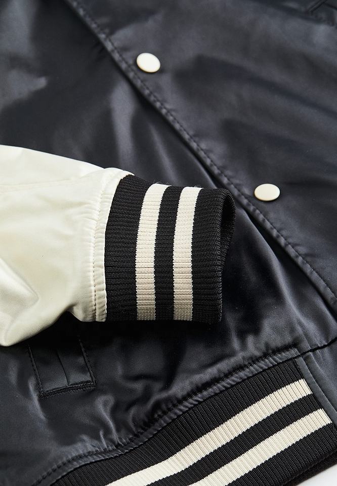 แจ็คเก็ตบอมเบอร์วาร์ซิตี้ผ้าซาตินคุณภาพสูง 100% เป็นมิตรกับสิ่งแวดล้อม สำหรับฤดูหนาว ขายส่ง บริการ OEM รับผลิตตามแบบ พร้อมปักชื่อทีม มีไซส์ใหญ่พิเศษ
