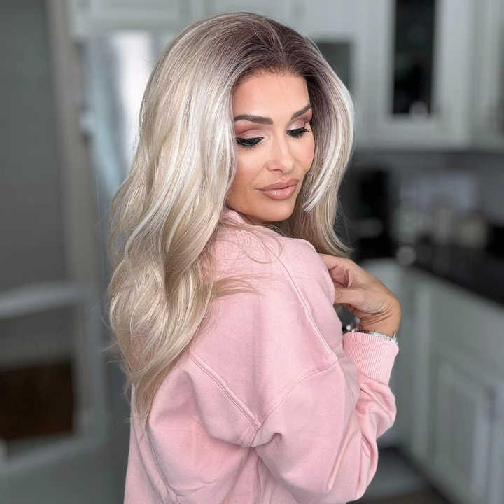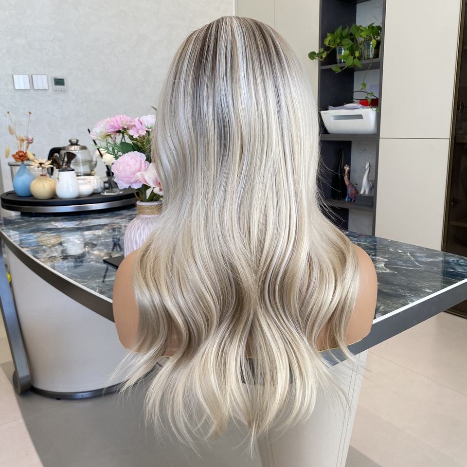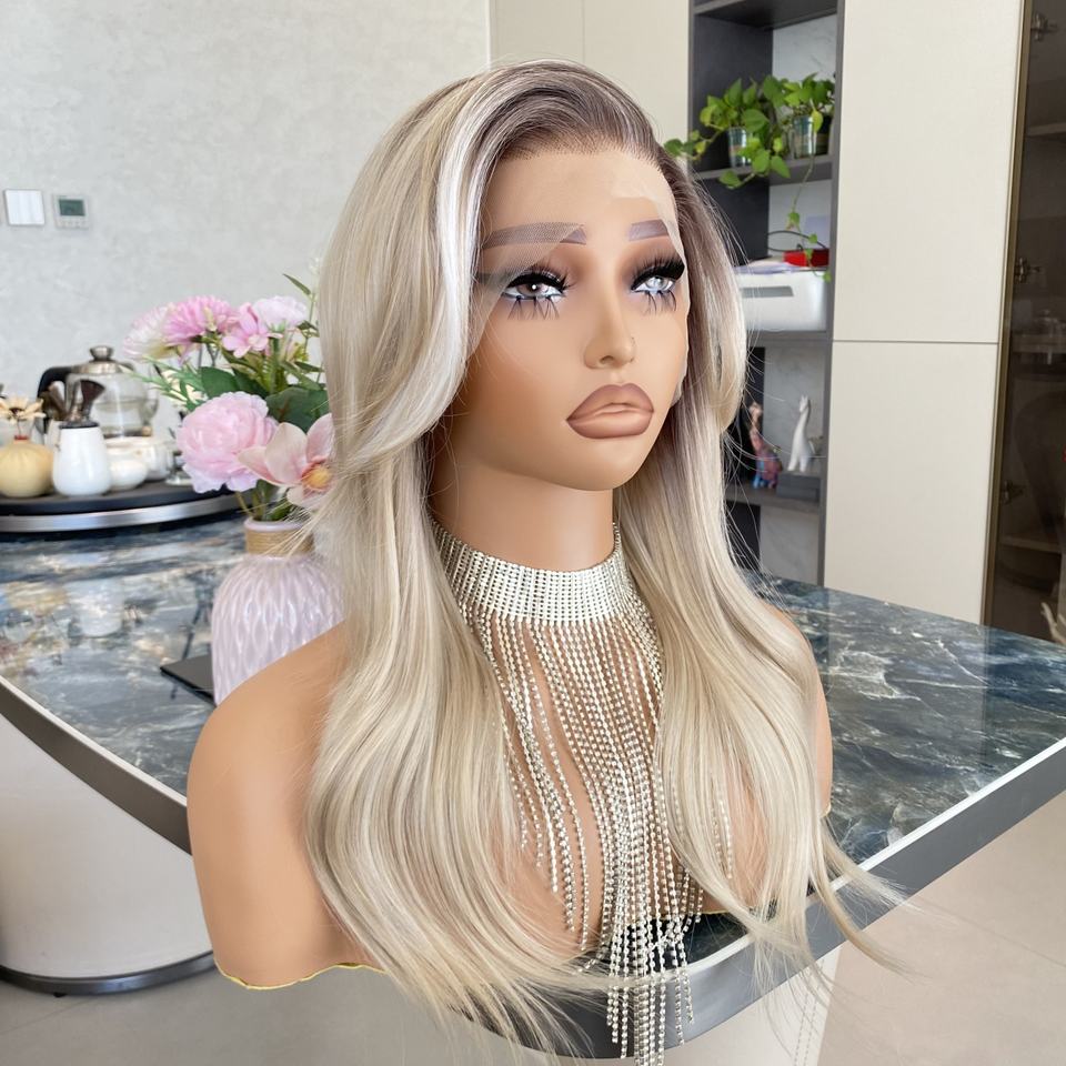 Wholesale High Quality Ash Blonde Highlight White Natural Wave 13x4 HD Transparent Synthetic Front Wigs Curtain Bangs Heat