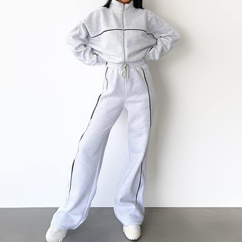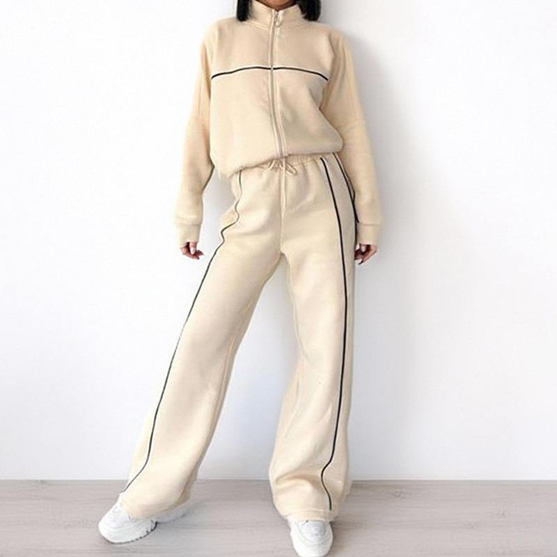 ชุดเซ็ตแทรคสูทลำลองแฟชั่นคุณภาพสูงแบบขายส่ง สีพื้น ซิปหน้า สำหรับผู้หญิง 2 ชิ้น