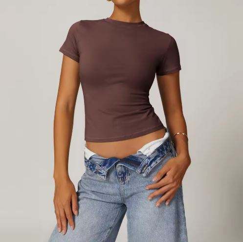 เสื้อยืดโยคะแบบครอปท็อปคุณภาพสูงขายส่ง เสื้อยืดผ้าฝ้ายผสมสแปนเด็กซ์ พิมพ์ลายและปักลาย เสื้อผ้าผู้หญิง