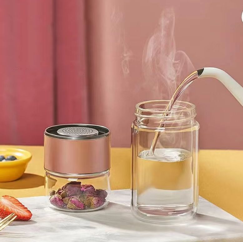 แก้วเก็บความร้อนผนังสองชั้นเครื่องชงชาแก้วเก็บความร้อนใช้ซ้ำได้ดีไซน์การ์ตูนสำหรับเดินทาง