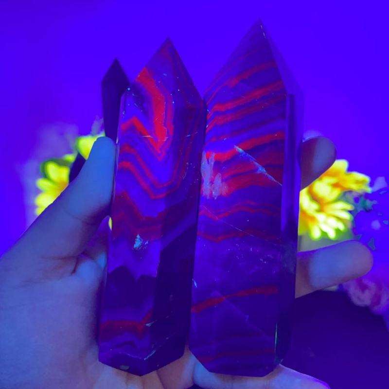 หินฟลูออไรต์สีดำเรืองแสงคุณภาพสูงแบบขายส่ง รูปทรงหอคอย ปลายแหลม สะท้อนแสง UV สำหรับตกแต่งบ้านและของประดับ