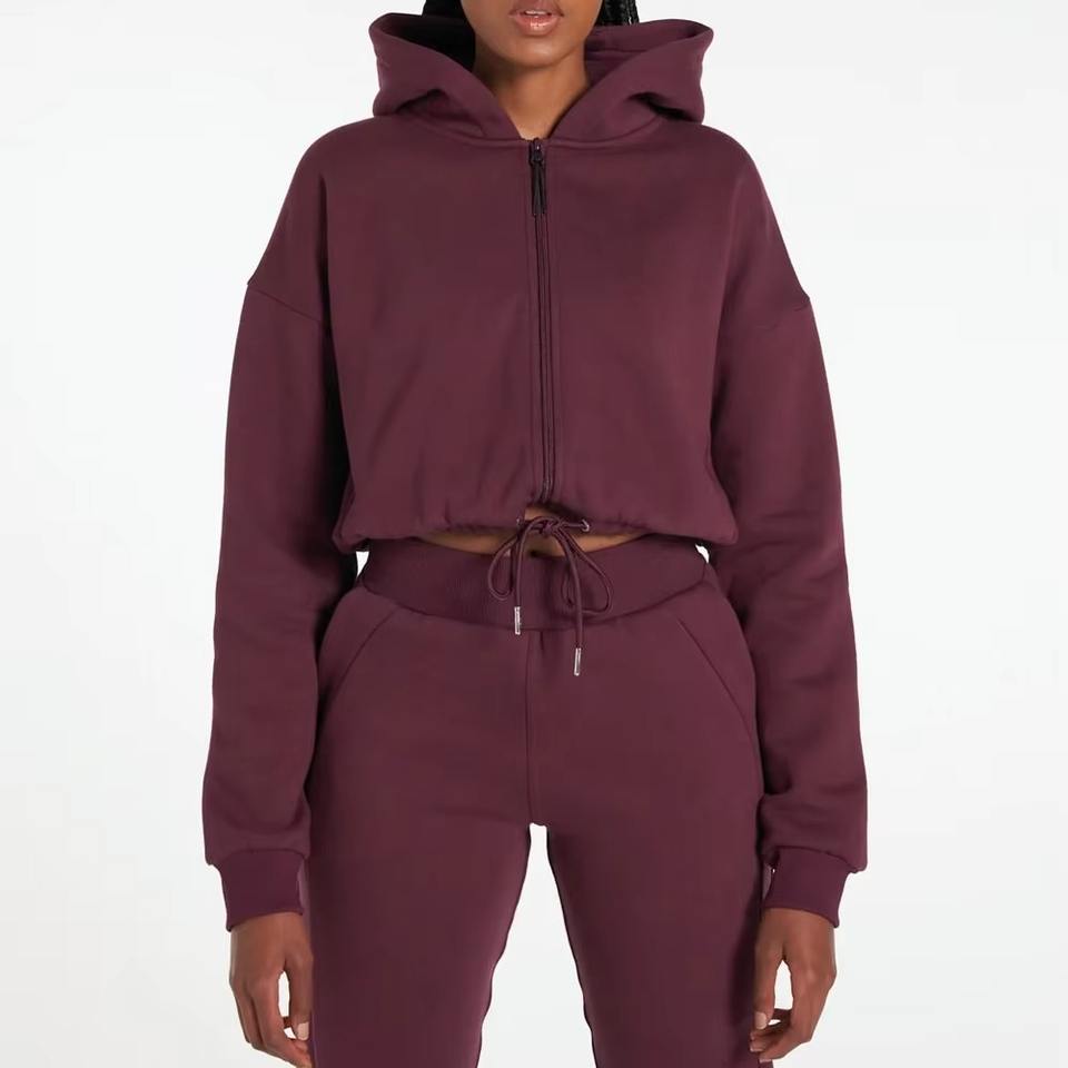 เสื้อฮู้ดผ้าฝ้ายขนแกะฝรั่งเศสสำหรับผู้หญิงเสื้อครอปและกางเกงขายาวดีไซน์แบบกำหนดเองโลโก้ด้านหน้า
