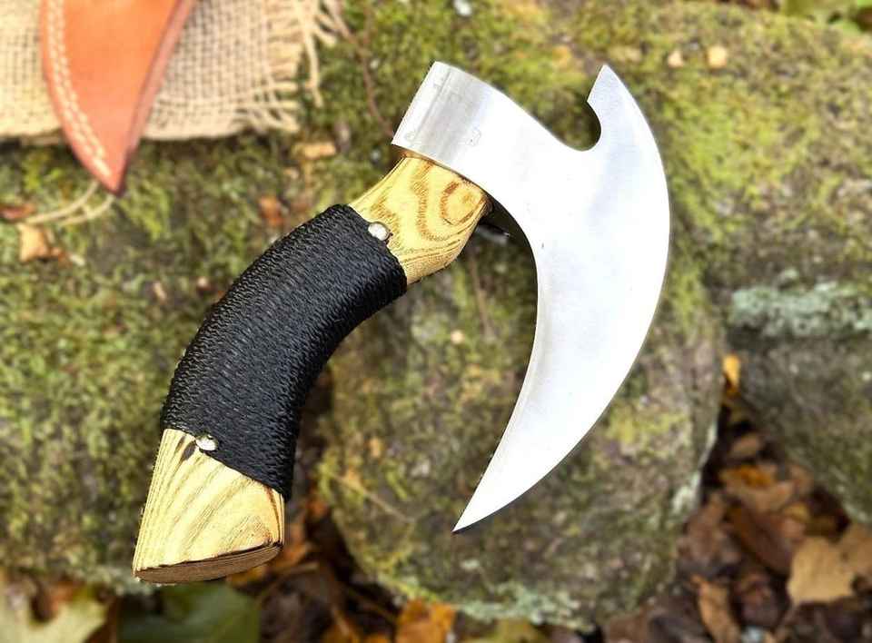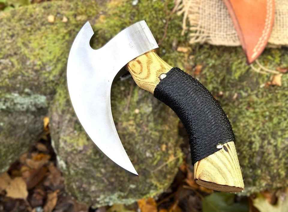 มีดตัดพิซซ่าเหล็กกล้าคาร์บอนสูงคุณภาพสูงขายส่ง งานตีขึ้นรูปด้วยมือ ขายดี มีดตัดพิซซ่าแบบไวกิ้ง พร้อมปลอกหนัง