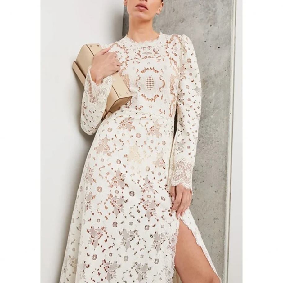 เดรสไหมพรมถักลายฉลุคุณภาพสูงสำหรับฤดูใบไม้ร่วง แขนยาว ผ่าข้าง แต่งลูกไม้ ซีทรู กระโปรงยาว