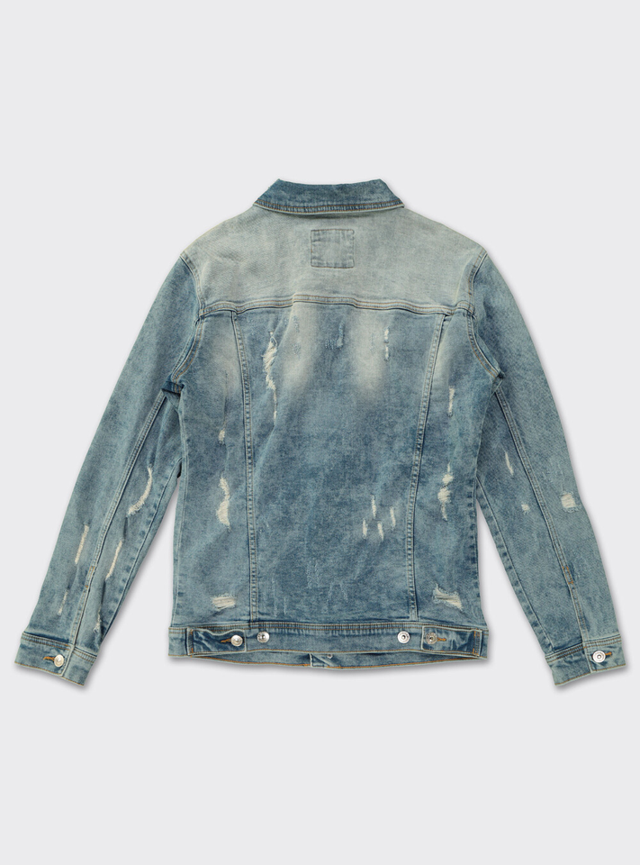 กางเกงยีนส์เดนิมทรงสลิมฟิตแบบวินเทจคุณภาพสูงสำหรับฤดูหนาว ล้างสีแบบแอซิดวอช แต่งดีเทลขาดๆ พร้อมเสื้อแจ็คเก็ตยีนส์แบบสั่งทำพิเศษสำหรับผู้ชาย ผ้าฝ้าย 100% ขายส่ง