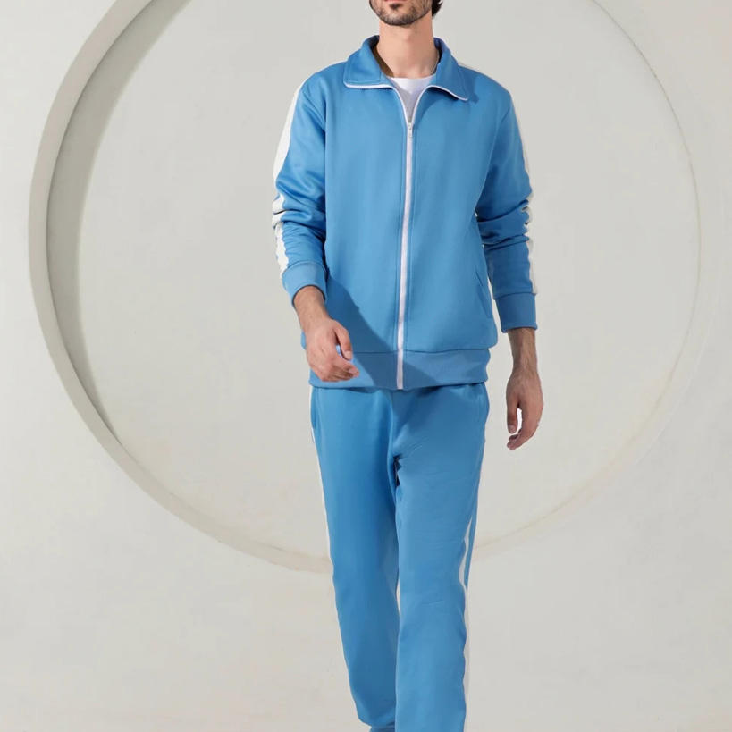 Wholesale High Quality Latest Travel Gym Athletic Wear Tracksuit Contrast Side Stripes Polyester Blue Men's Jogging Track Suit
