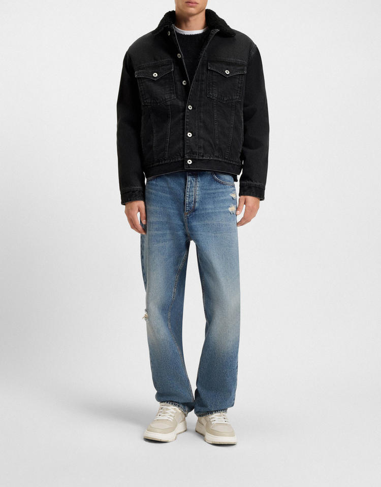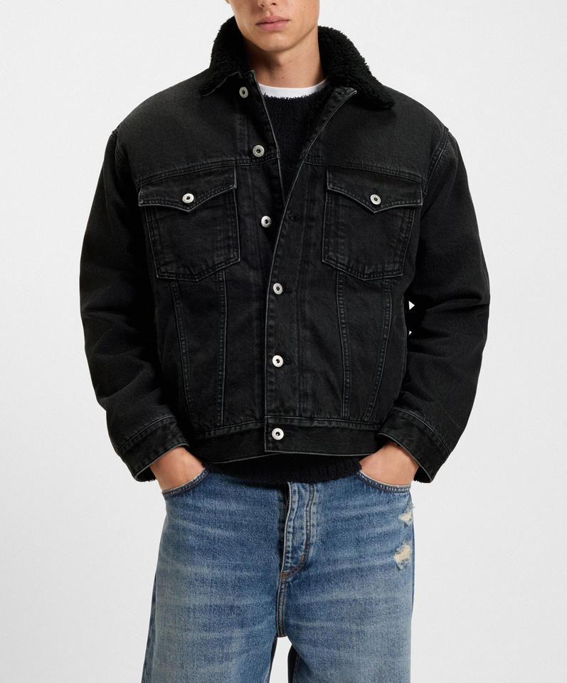 แจ็คเก็ตยีนส์ผู้ชายคุณภาพสูงขายส่ง แบบสั่งทำพิเศษ สไตล์วินเทจ คอตั้ง ปักโลโก้ด้านหน้า ซับในขนแกะแบบกลับด้านได้