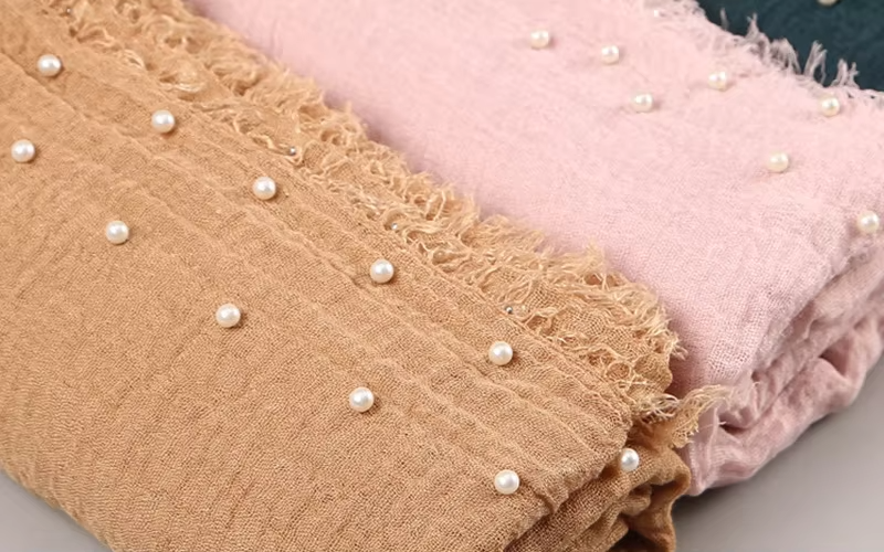 ผ้าพันคอฮิญาบผ้าฝ้ายอัดจีบสำหรับผู้หญิงฮิญาบพร้อมไข่มุกระบายอากาศได้หรูหรา