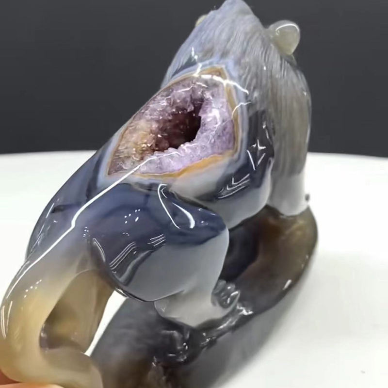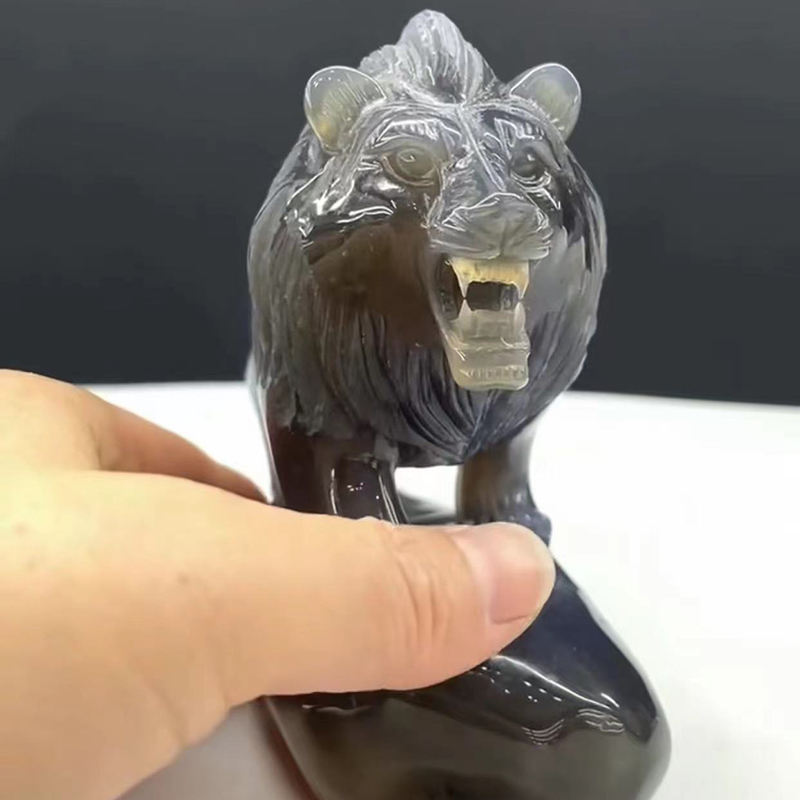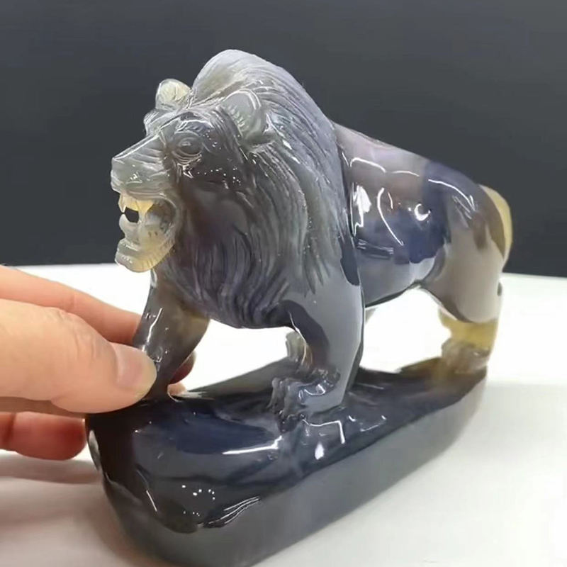 ขายส่งที่มีคุณภาพสูงที่สมจริงอัญมณีมือแกะสลักสัตว์ประติมากรรมอเมทิสต์โมราคลัสเตอร์สิงโตสำหรับตกแต่งบ้าน