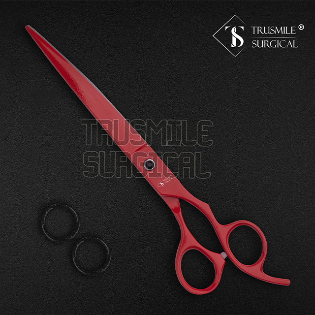 กรรไกรตัดผมสีแดงกรรไกรตัดผมสแตนเลสปลายใบมีดคมสำหรับจัดแต่งทรงผม