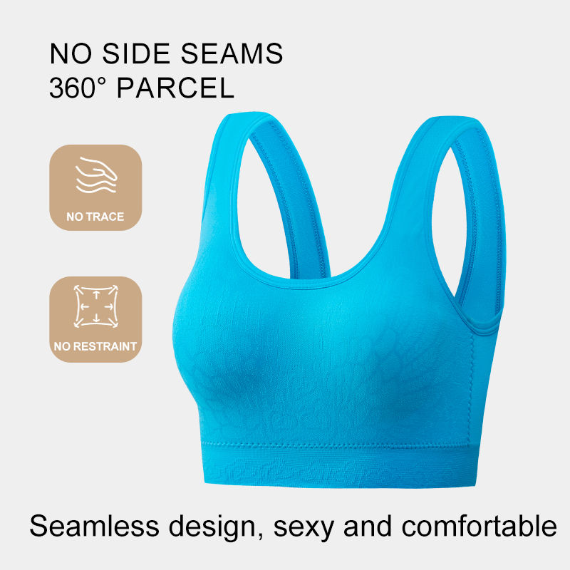 เสื้อชั้นในแบบสปอร์ตบราบุฟองน้ำสีฟ้าสำหรับผู้หญิงบราดันหน้าอกแบบไม่มีรอยต่อโลโก้บนถ้วยฟรีไซส์