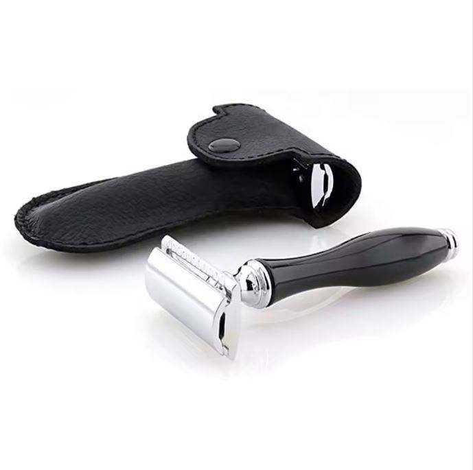 มีดโกนนิรภัยพร้อมที่จับไม้ใบมีดสแตนเลสและเคสหนังสำหรับการโกนหนวดแบบมืออาชีพ