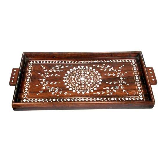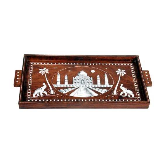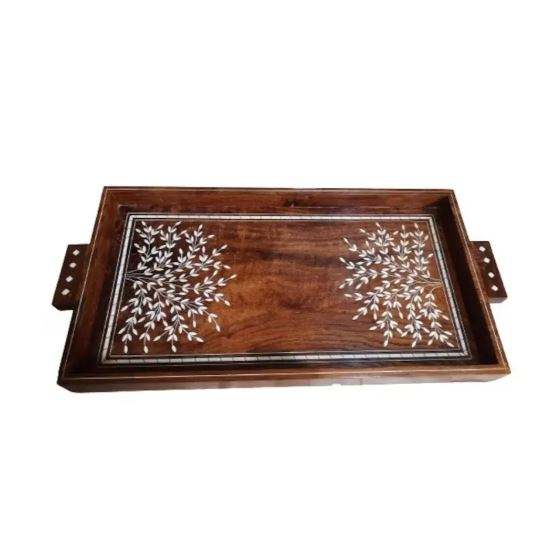 ถาดเสิร์ฟไม้ธรรมชาติพร้อมฝังมุกสำหรับปาร์ตี้อาหรับบนโต๊ะอาหารอินเดีย