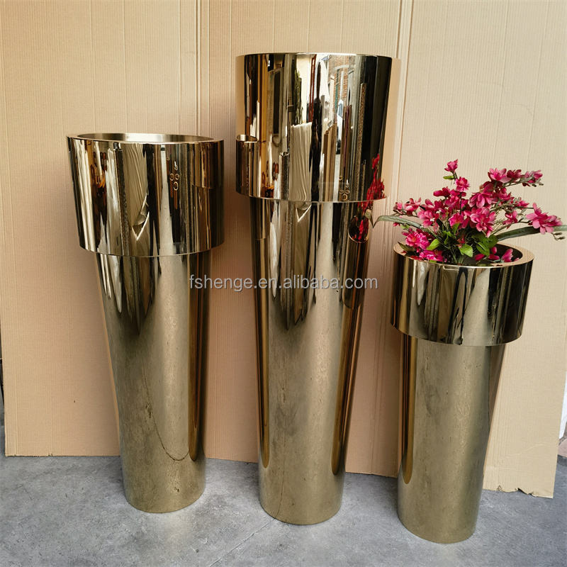 กระถางต้นไม้สแตนเลสสตีลหรูหราสำหรับตกแต่งบ้าน / อุปกรณ์ทำสวน กระถางปลูกต้นไม้ขนาดใหญ่ / แจกันตั้งพื้นทรงสูงสีทอง
