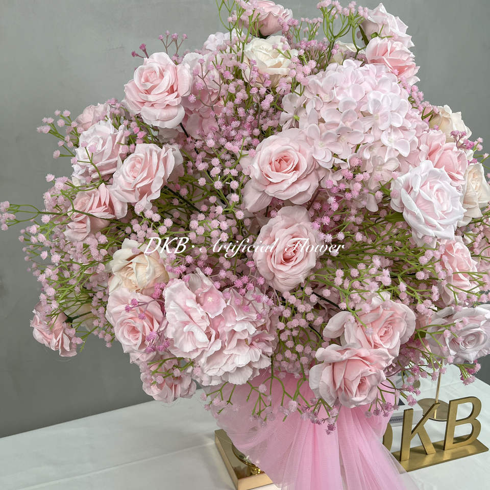 ดอกไม้เทียมสีชมพูประดับกลางโต๊ะสำหรับตกแต่งงานแต่งงาน