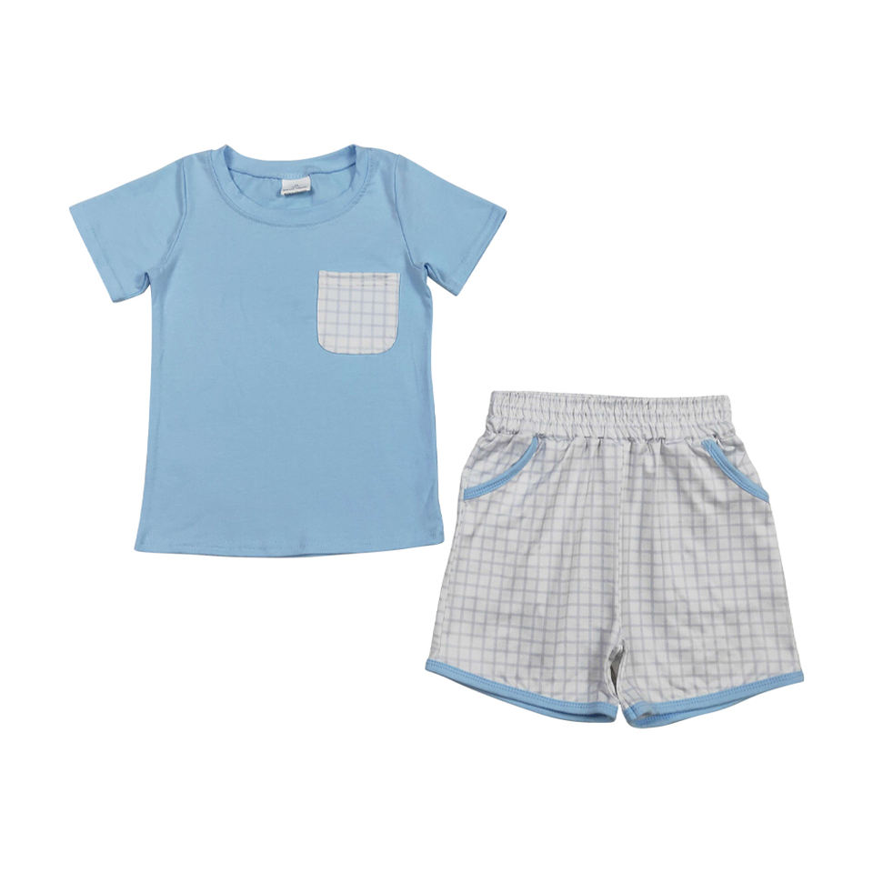 ชุดเด็กผู้ชายขายส่งคุณภาพสูง เสื้อยืดแขนสั้นสีน้ำเงิน กางเกงขาสั้นลายพรางมีกระเป๋า ชุดสองชิ้น