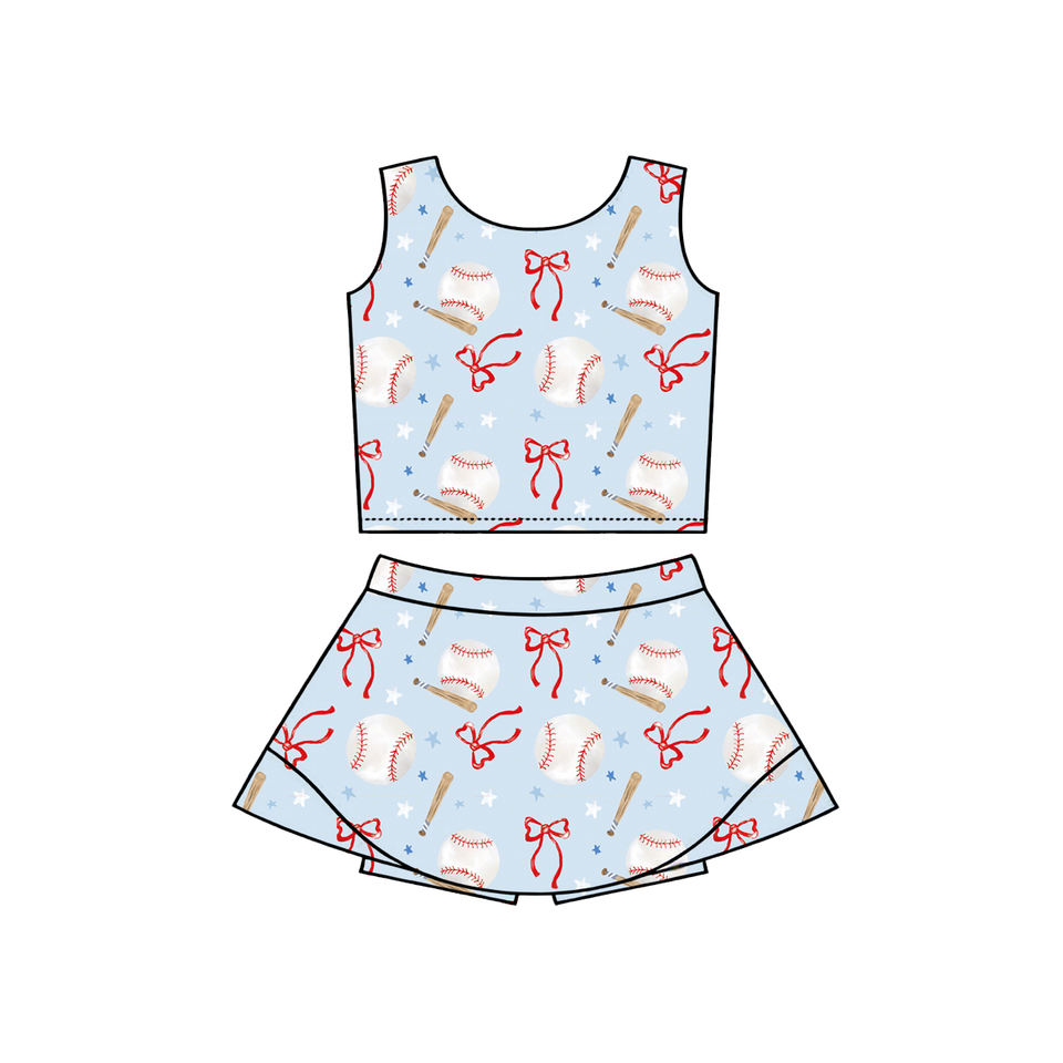 เสื้อกล้ามพิมพ์ลายโบว์ซอฟต์บอลสำหรับเด็กผู้หญิง พร้อมกระโปรง ชุดออกกำลังกาย โพลีเอสเตอร์ ขายส่งราคาถูก แฟชั่นทันสมัย