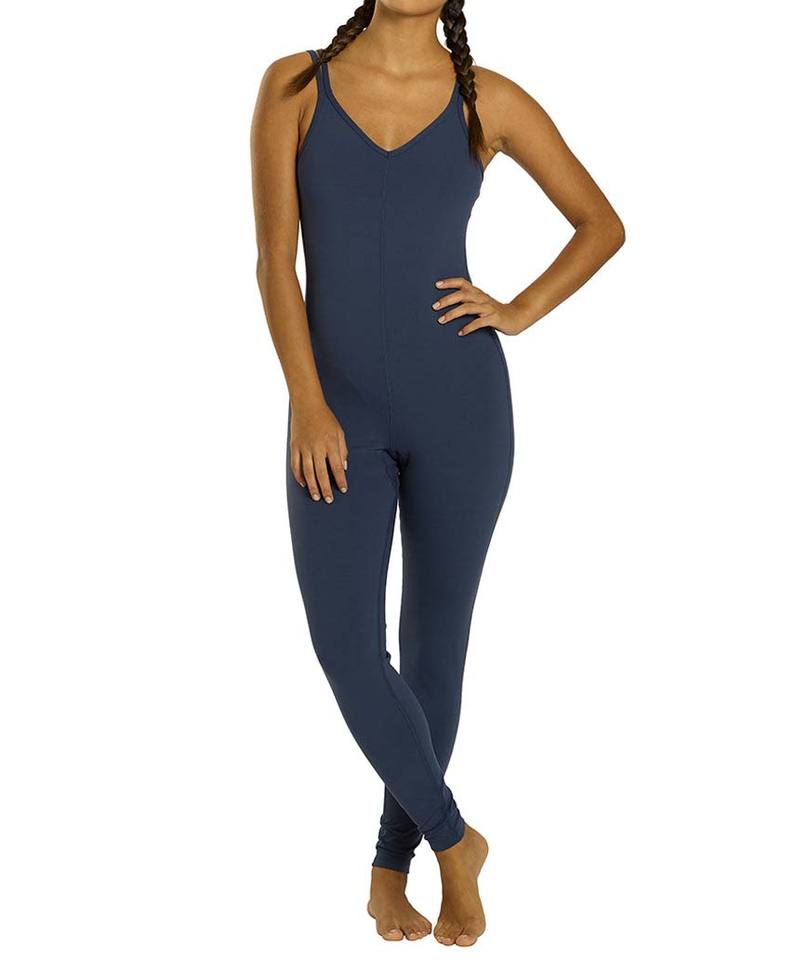 ชุดบอดี้สูทออกกำลังกายแฟชั่นขายส่งยอดนิยมสำหรับผู้หญิง คอวี แขนกุด สีน้ำเงินเข้ม ผ้าสปอร์ตยืดหยุ่น กระชับรูปร่าง เหมาะสำหรับโยคะ