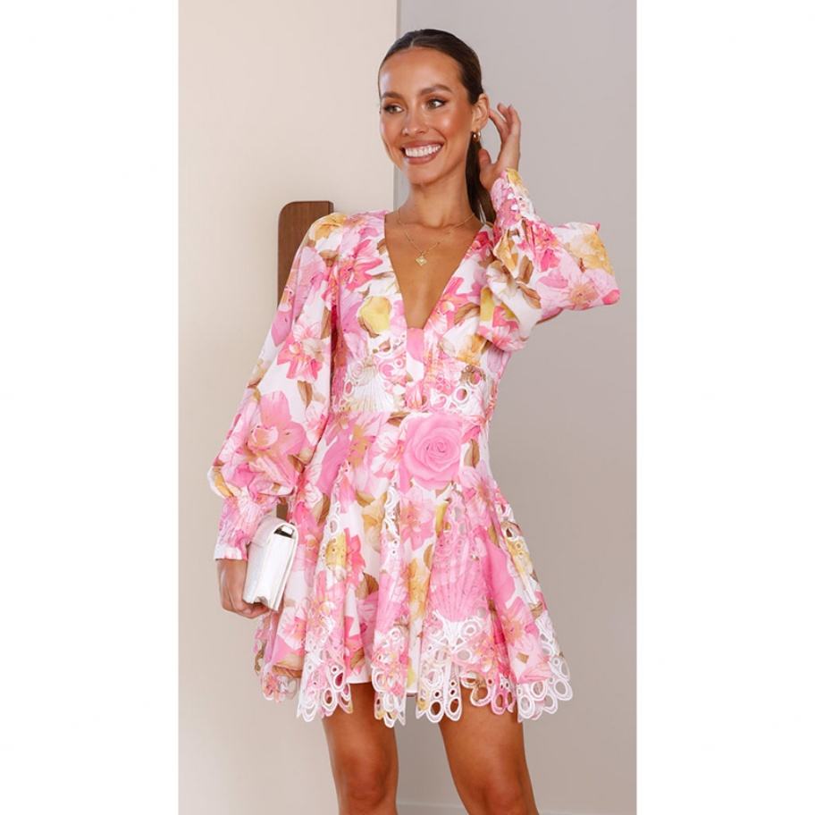 เดรสสั้นพิมพ์ลายดอกไม้เอวธรรมชาติ แต่งระบายลูกไม้ แขนพอง คอวีลึก สไตล์ฮิต ขายส่งสำหรับผู้หญิง