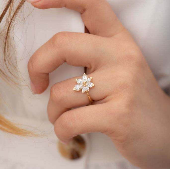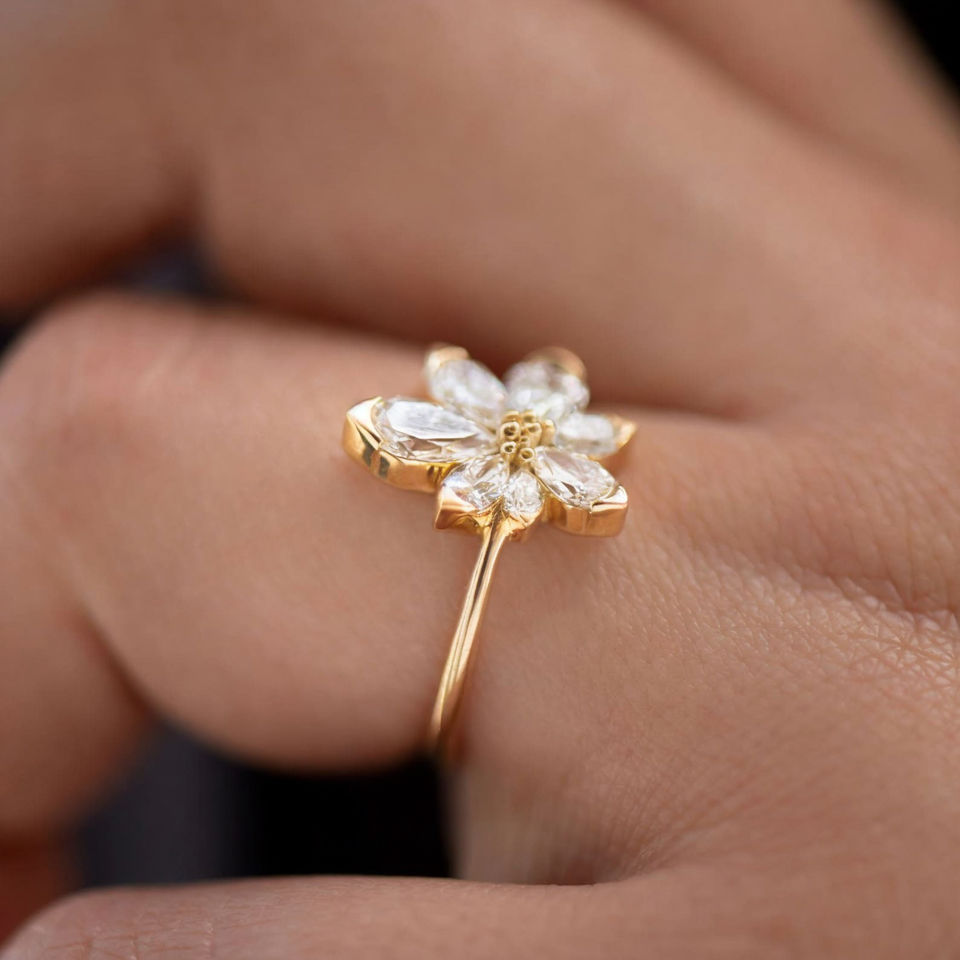 แหวนเพชรเพียร์ทรงดอกไม้ ดีไซน์หรูหรา ทองคำ 14K ประดับเพชรเพาะเลี้ยง IGI แท้ ของขวัญวันครบรอบสำหรับเธอ