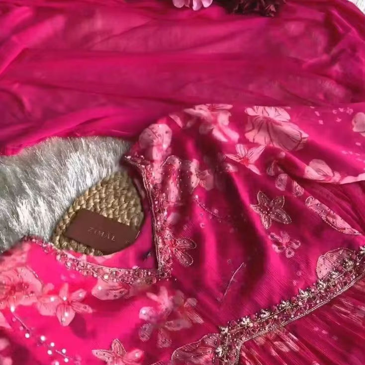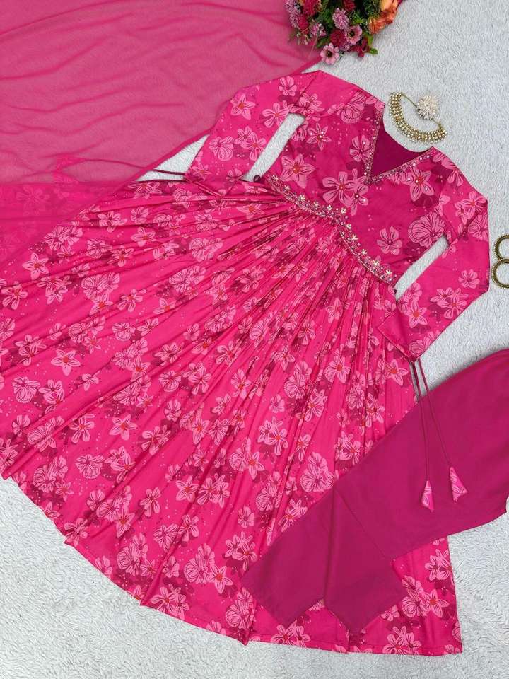 ชุดนักออกแบบชาวอินเดียผ้าฝ้ายมัสลินสีชมพูพิมพ์ดิจิตอลและมือทำงาน nyra กับ Aliya ตัดด้านบนและกางเกงกับ dupatta