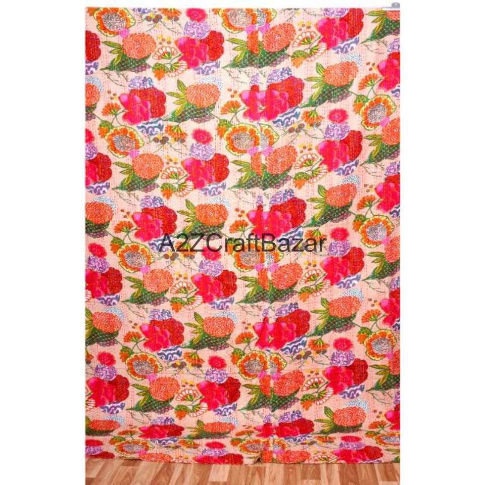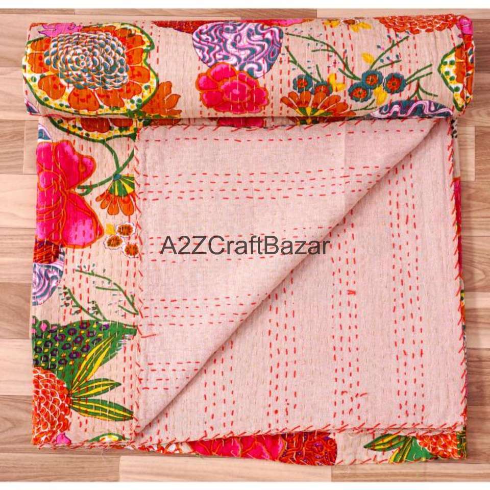 ผ้าห่มควิลท์คันธาอินเดียแบบวินเทจขายส่ง ทำมือ ผ้าฝ้ายสองด้าน ผ้าคลุมเตียงสไตล์โบฮีเมียน สีสันหลากหลาย ของตกแต่งบ้าน