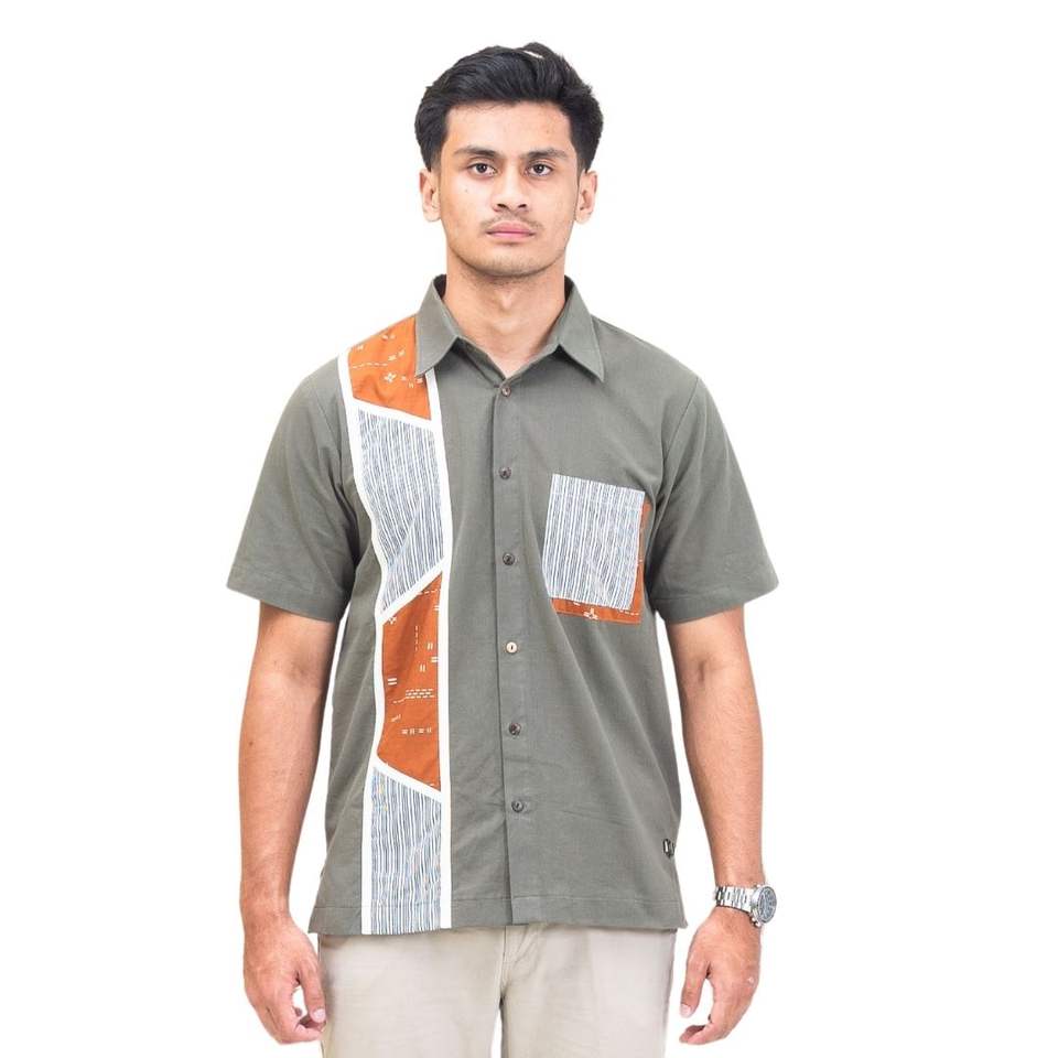 เสื้อเชิ้ตแขนสั้นสไตล์อินโดนีเซียแบบกระดุมสองแถว ลายพรางเรขาคณิตสองสี โทนสีเขียวมะกอก สำหรับขายส่ง