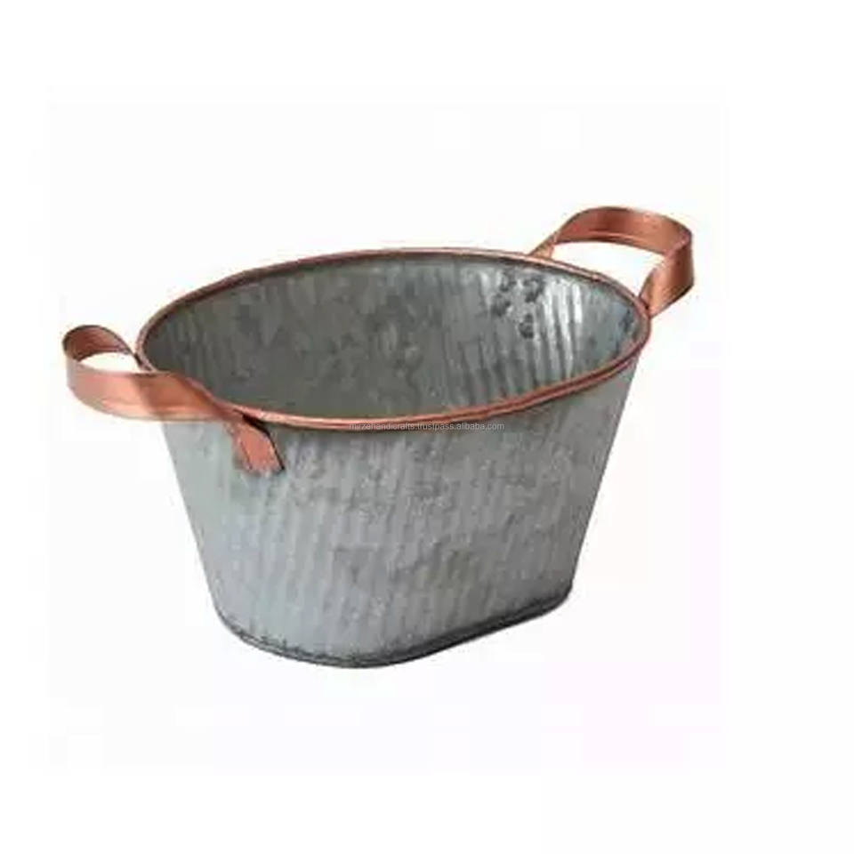 กระถางต้นไม้โลหะชุบสังกะสีพร้อมที่จับสีทองแดงสำหรับปลูกในร่มและกลางแจ้งสำหรับบ้านไร่