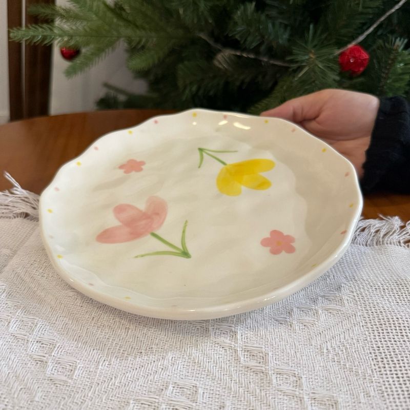 จานเซรามิกลายดอกไม้แบบใช้มือนวดและทาสีด้วยมือสำหรับเค้กของหวานและจาน
