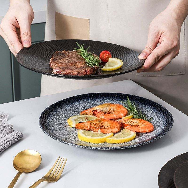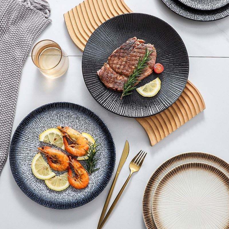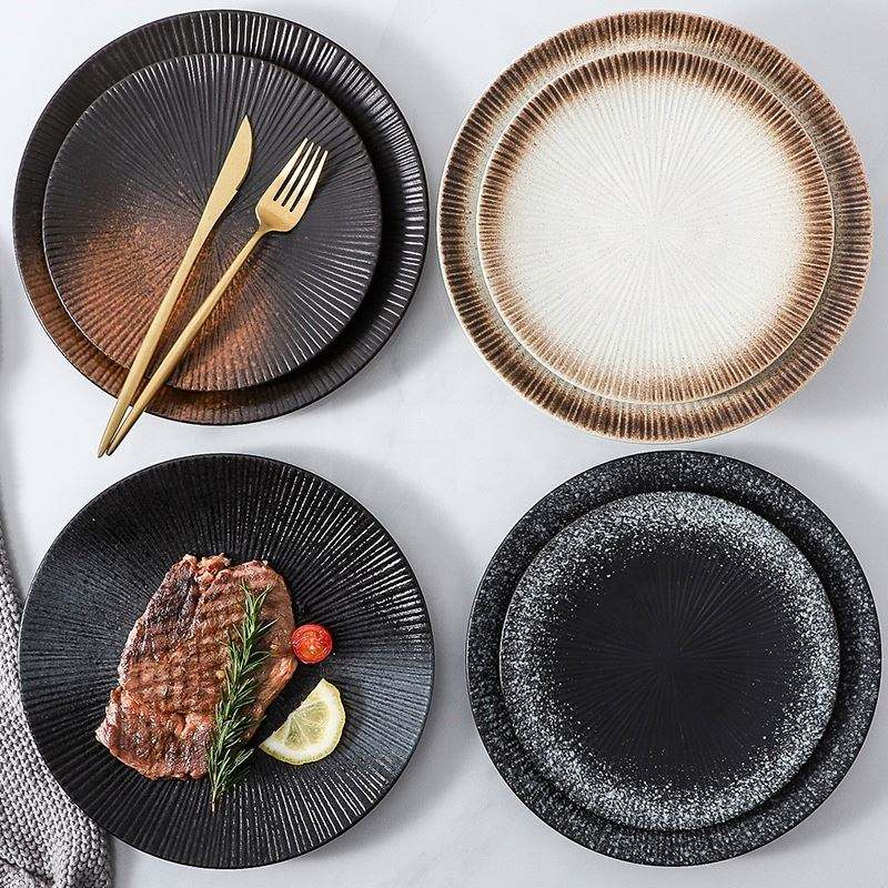 จานสเต็กพอร์ซเลนสไตล์ญี่ปุ่นย้อนยุคอาหารตะวันตก8/10นิ้วจานเซรามิกบนโต๊ะอาหารสำหรับร้านอาหารโรงแรม