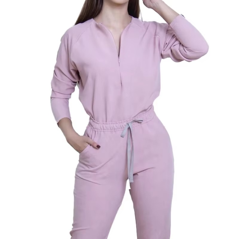 ชุดเครื่องแบบโรงพยาบาลสำหรับคลินิกชุดเสริมสวยสีชมพูสำหรับผู้หญิงชุดวิ่งป้องกันของเหลวขัดผิว