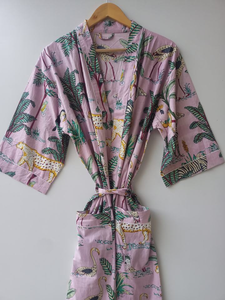 ชุดคลุมกิโมโนลายป่า ขายส่ง ผ้าฝ้าย 100% ทำมือ ลายดอกไม้และสัตว์ ชุดนอนยาว แขนยาว มีกระเป๋า