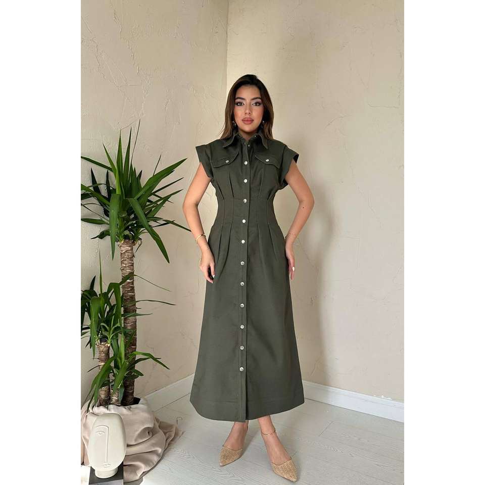 เดรสผ้ากาบาร์ดีนสีกากีทรงเอ คอโอ เอวธรรมชาติ สไตล์ลำลองสำหรับใส่ทุกวัน ผ้าทอ ซักได้ ขายส่ง